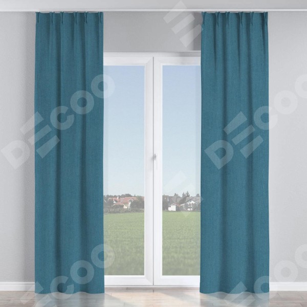 Комплект прямых штор, от производителя «Cortin», пошиты из ткани лён блэкаут синий, артикул ткани 69528. С изнаночной стороны в верхней части штор пристрачивается шторная лента с декоративными складками «Кустик». Для создания элегантных складок прямые шторы шьются по стандарту с коэффициентом 1:2 (на 100 см. ширины проёма 200 см. ширины ткани).