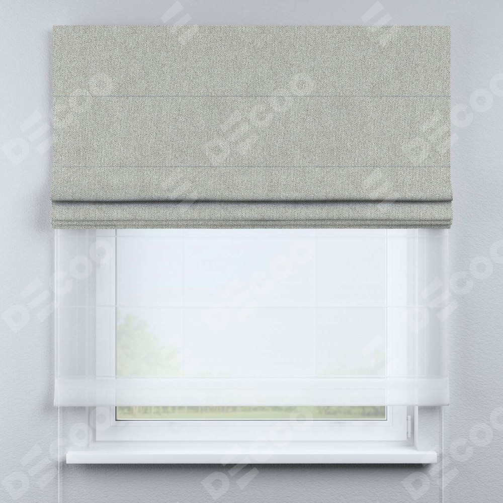 Римская штора день-ночь производителя «Cortin», используется для проёма, пошита из двух полотен, с лицевой стороны твид блэкаут коричнево-серый артикул 21574, вторая ткань тюль (по стандарту комплектуется тюль белого цвета артикул V-01). Имеет универсальный механизм и подходит для монтажа: на потолок, на стену и в нишу.