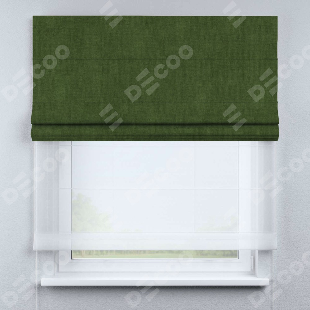 Римская штора день-ночь производителя «Cortin», используется для проёма, пошита из двух полотен, с лицевой стороны вельвет тёмно-салатовый артикул 33805, вторая ткань тюль (по стандарту комплектуется тюль белого цвета артикул V-01). Имеет универсальный механизм и подходит для монтажа: на потолок, на стену и в нишу.