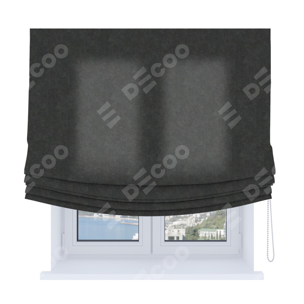 Римская штора Soft производителя «Cortin», используется для проёма, пошита из ткани вельвет тёмно-серый, артикул ткани 33811. Имеет универсальный механизм и подходит для монтажа: на потолок, на стену и в нишу. В отличие от стандартных римских штор, римская штора Soft не имеет горизонтальных вставок и нижнего отвеса. Это позволяет ткани произвольно драпироваться в свободные мягкие складки.
