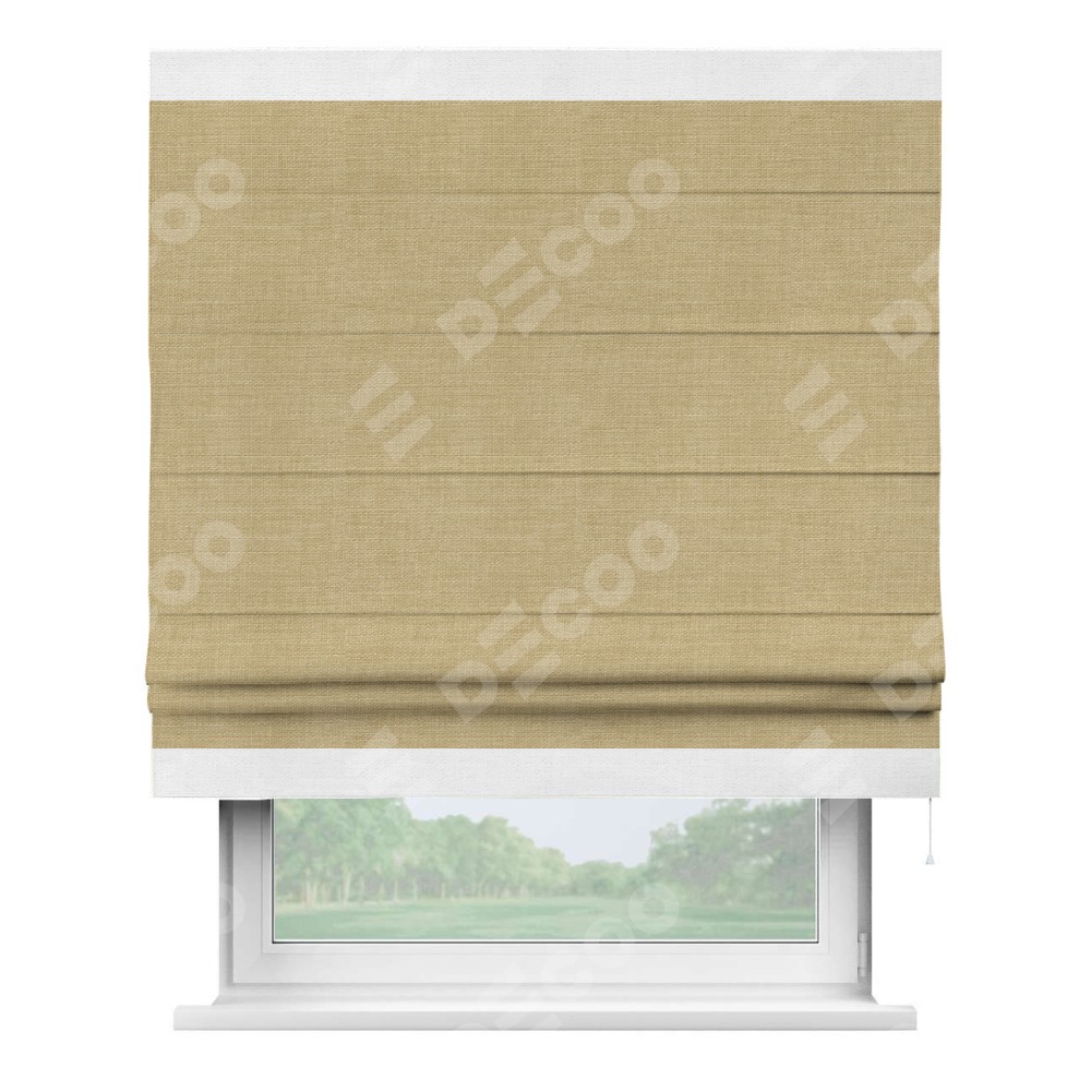 Римская штора производителя «Cortin», используется для проёма, пошита из ткани лён бежевый, артикул 7442. Отделка шторы кантом «Горизонт», ткань для канта используется из льна разной расцветки на выбор. Имеет универсальный механизм и подходит для монтажа: на потолок, на стену и в нишу.