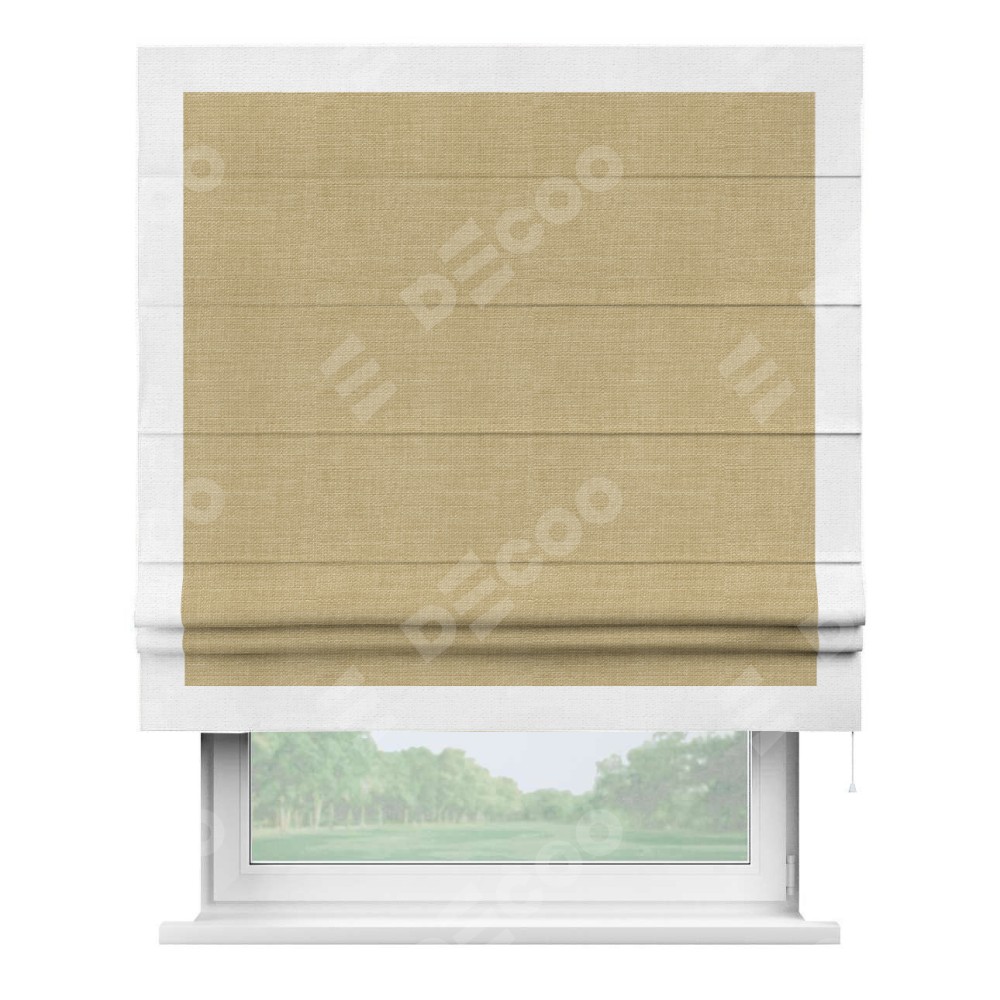 Римская штора производителя «Cortin», используется для проёма, пошита из ткани лён бежевый, артикул 7442. Отделка шторы кантом «Чесс», ткань для канта используется из льна разной расцветки на выбор. Имеет универсальный механизм и подходит для монтажа: на потолок, на стену и в нишу.