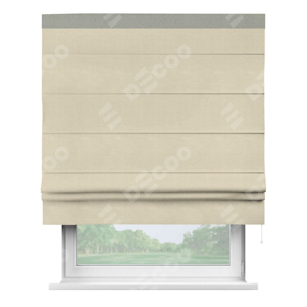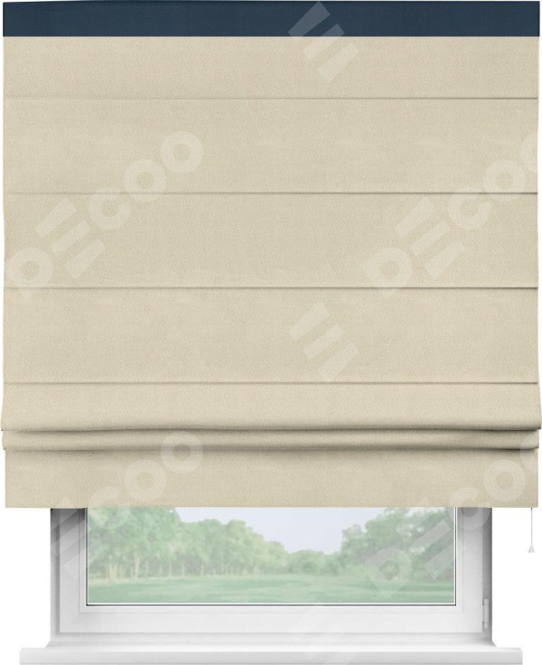Римская штора производителя «Cortin», используется для проёма, пошита из ткани блэкаут однотонный бежевый, артикул ткани 13125. Отделка шторы кантом «Кинг», ткань для канта используется из блэкаута однотонного разной расцветки на выбор. Имеет универсальный механизм и подходит для монтажа: на потолок, на стену и в нишу.