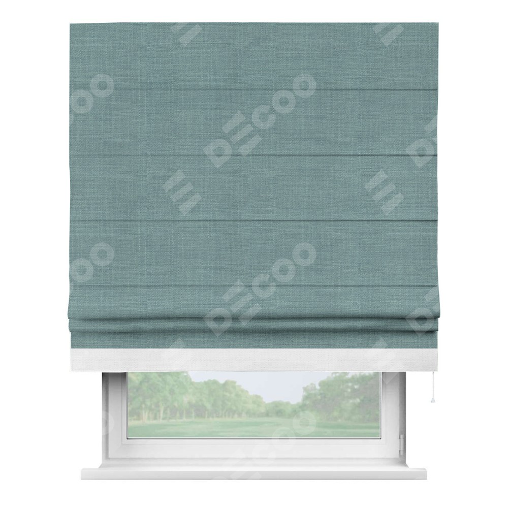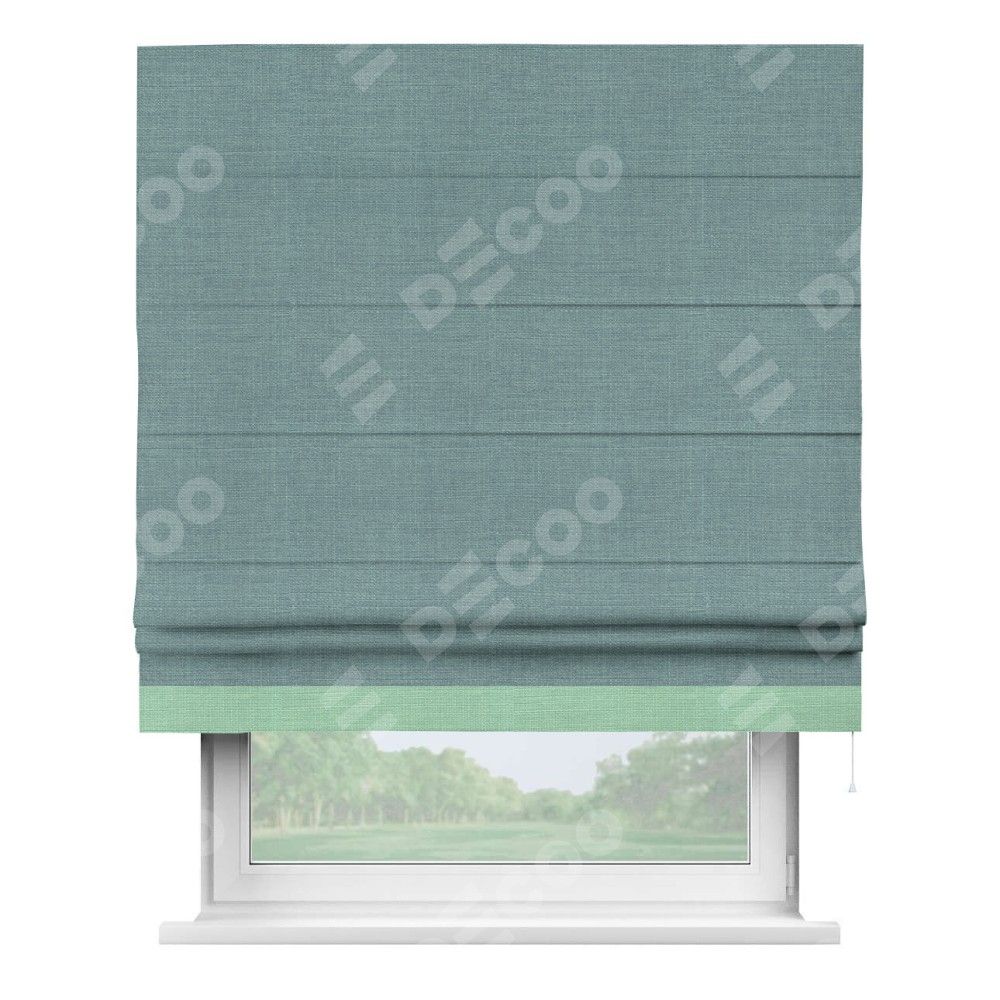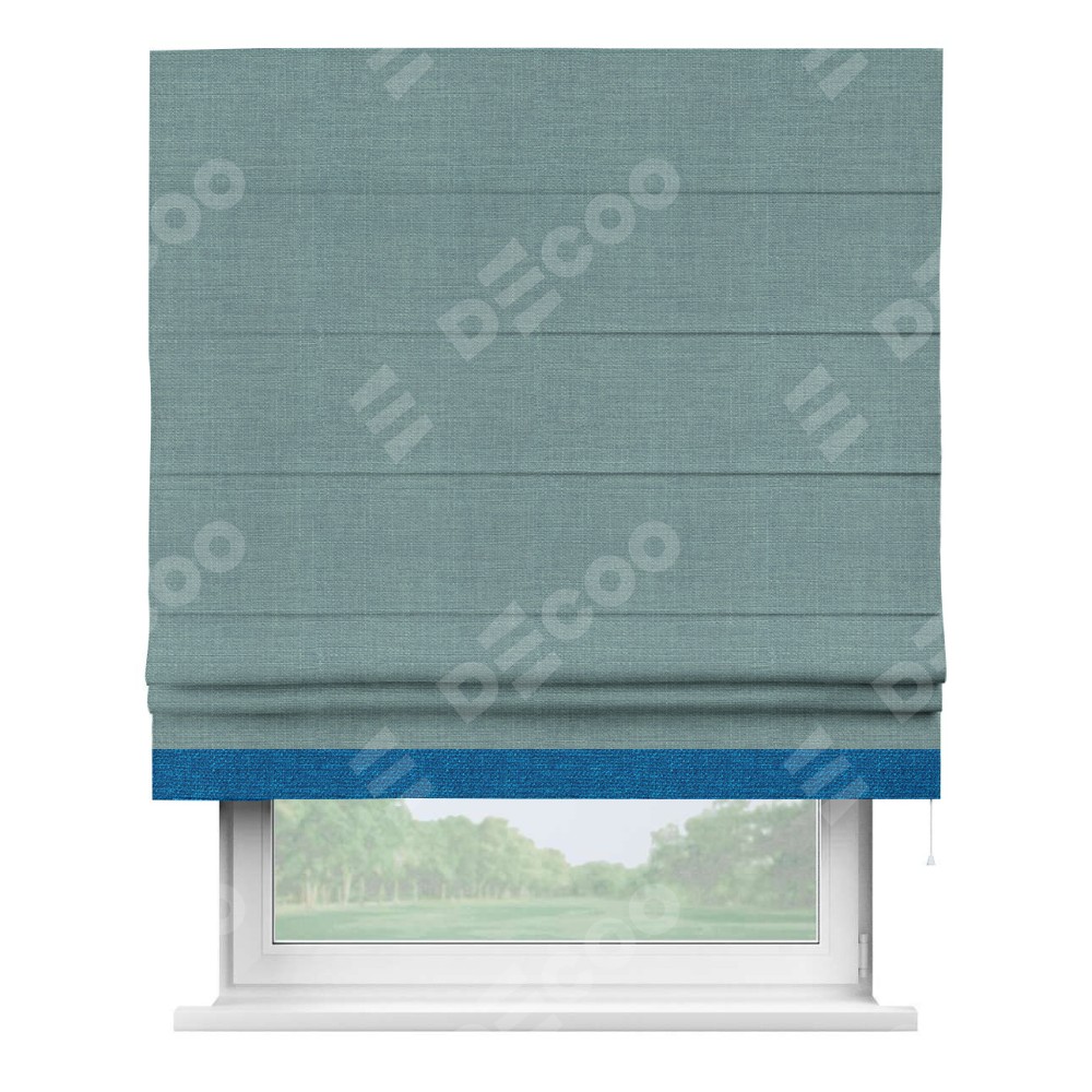Римская штора производителя «Cortin», используется для проёма, пошита из ткани лён голубой, артикул 74736. Отделка шторы кантом «Джестер», ткань для канта используется из льна разной расцветки на выбор. Имеет универсальный механизм и подходит для монтажа: на потолок, на стену и в нишу.