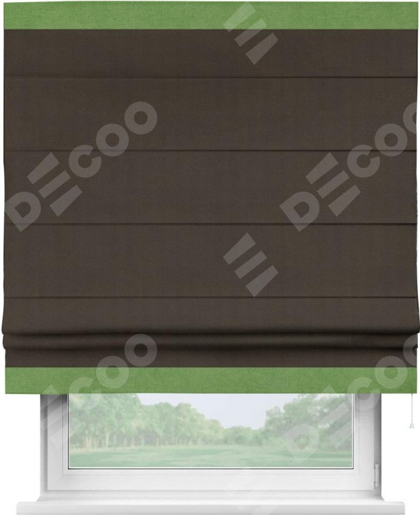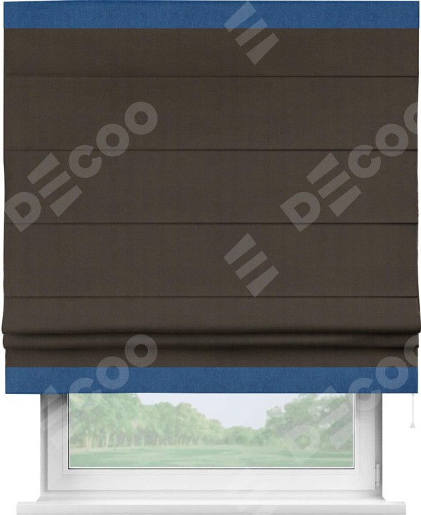 Римская штора производителя «Cortin», используется для проёма, пошита из ткани вельвет тёмно-коричневый, артикул ткани 30991. Отделка шторы кантом «Горизонт», ткань для канта используется из вельвета разной расцветки на выбор. Имеет универсальный механизм и подходит для монтажа: на потолок, на стену и в нишу.