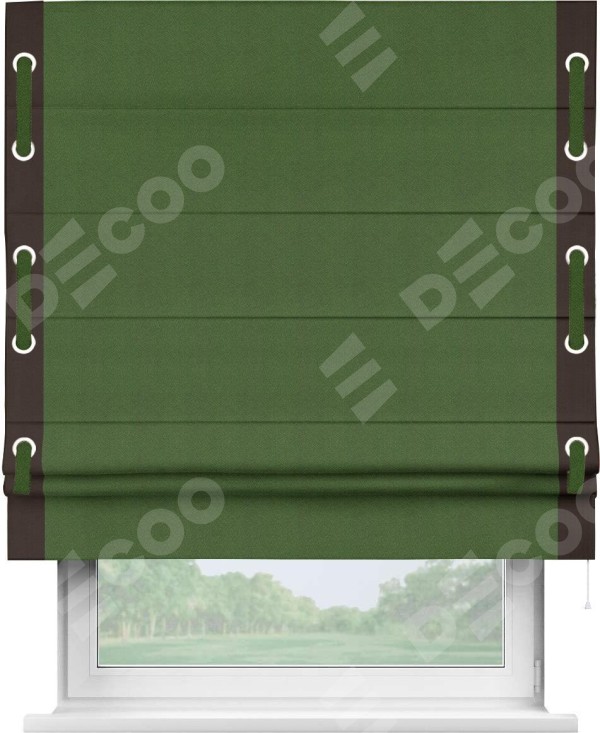 Римская штора производителя «Cortin», используется для проёма, пошита из ткани блэкаут однотонный зелёный перламутр, артикул ткани 81859−2. Отделка шторы кантом «Стрим Дуо» на кантах расположены люверсы с пояском, ткань для канта используется из блэкаута однотонного разной расцветки на выбор. Ткань для пояска обычно используется из основной ткани шторы, а так же можно сделать из любой расцветки по желанию. Имеет универсальный механизм и подходит для монтажа: на потолок, на стену и в нишу.