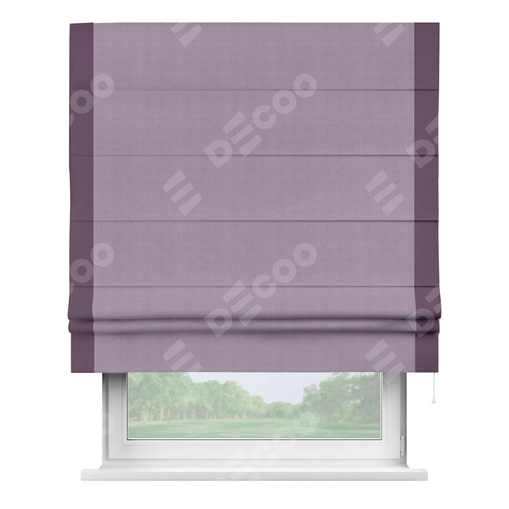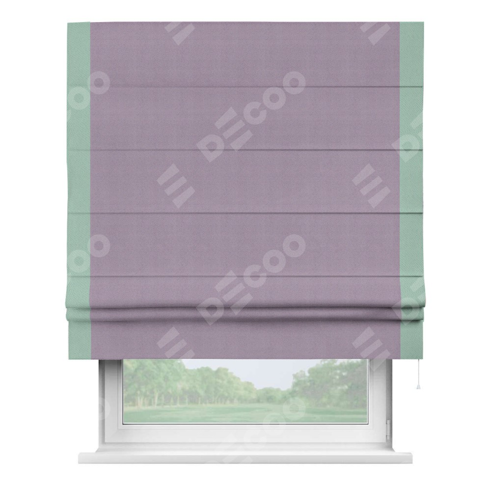 Римская штора производителя «Cortin», используется для проёма, пошита из ткани блэкаут однотонный светло-сиреневый, артикул ткани 29333−1. Отделка шторы кантом «Стрим Дуо», ткань для канта используется из блэкаута однотонного разной расцветки на выбор. Имеет универсальный механизм и подходит для монтажа: на потолок, на стену и в нишу.