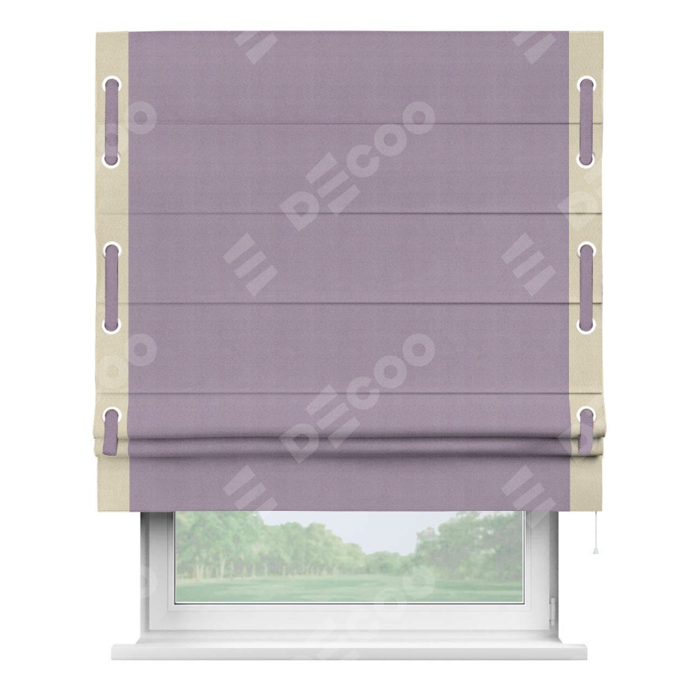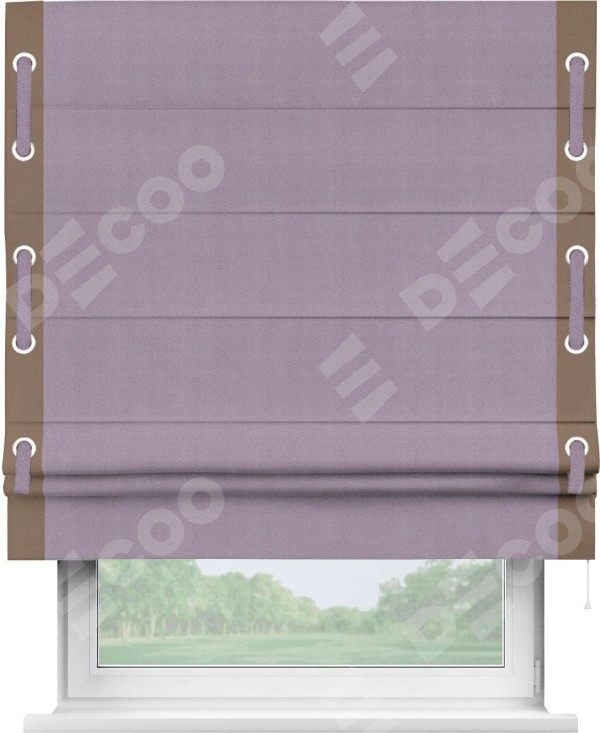 Римская штора производителя «Cortin», используется для проёма, пошита из ткани блэкаут однотонный светло-сиреневый, артикул ткани 29333−1. Отделка шторы кантом «Стрим Дуо» на кантах расположены люверсы с пояском, ткань для канта используется из блэкаута однотонного разной расцветки на выбор. Ткань для пояска обычно используется из основной ткани шторы, а так же можно сделать из любой расцветки по желанию. Имеет универсальный механизм и подходит для монтажа: на потолок, на стену и в нишу.