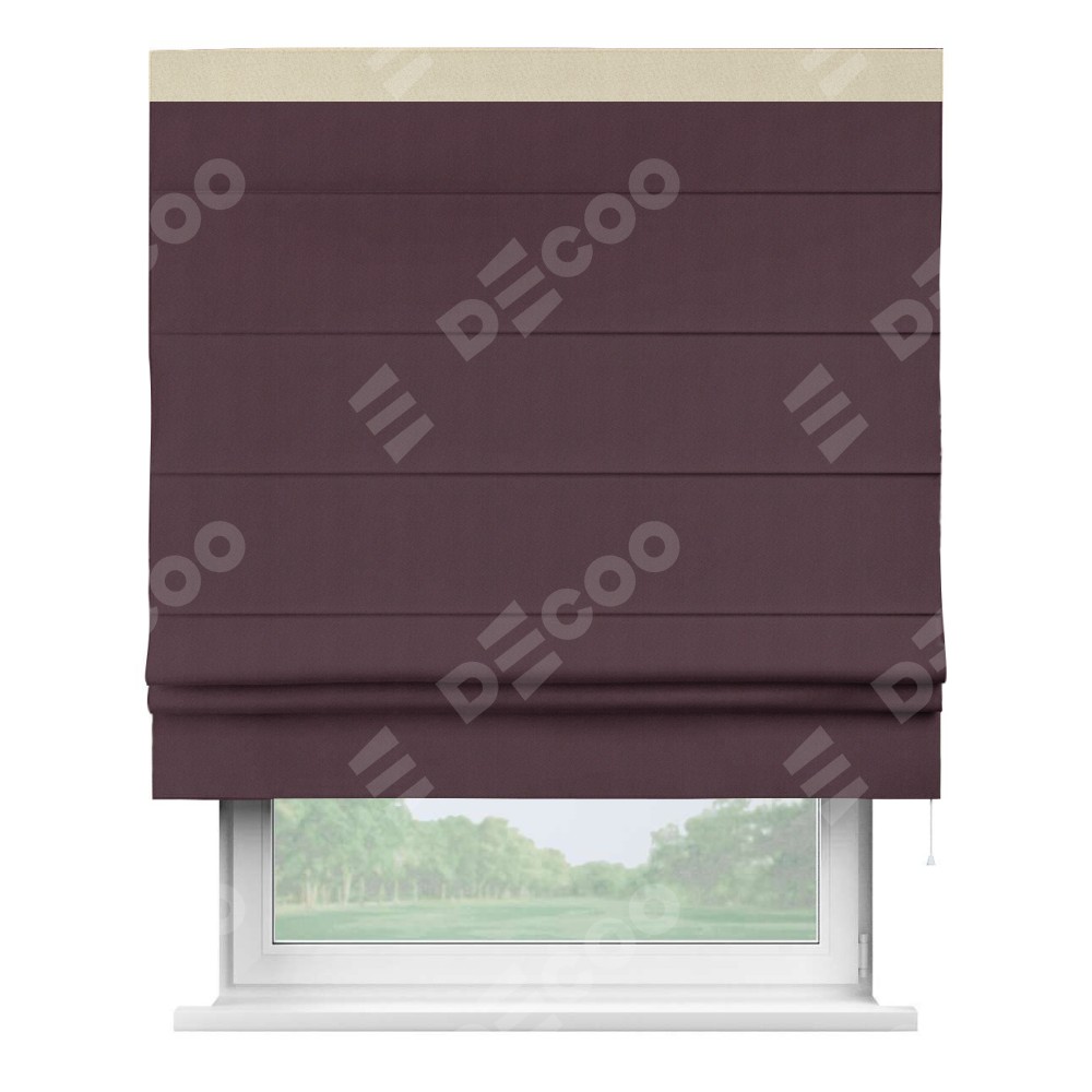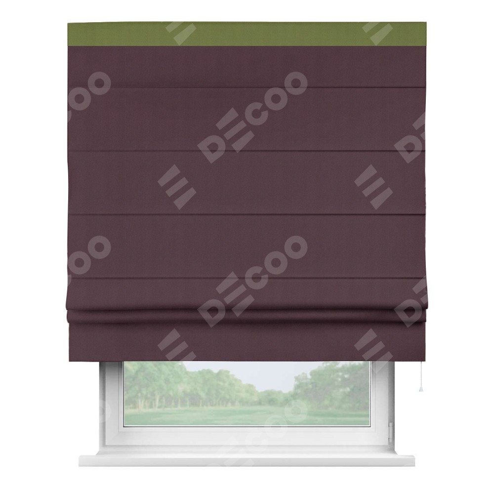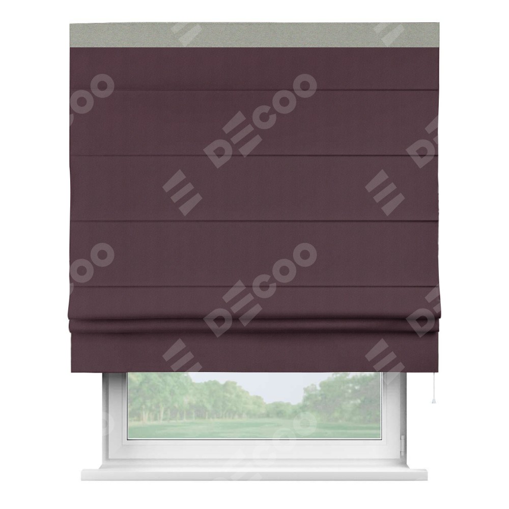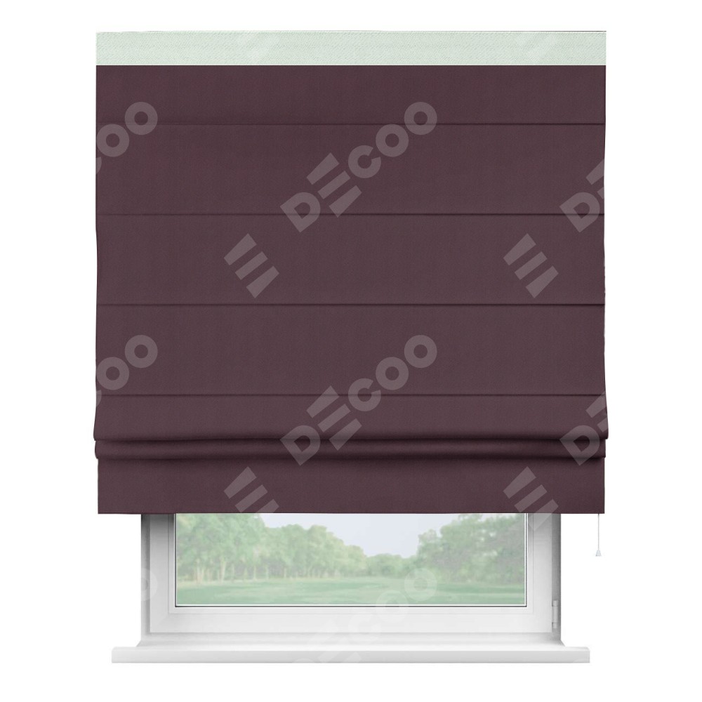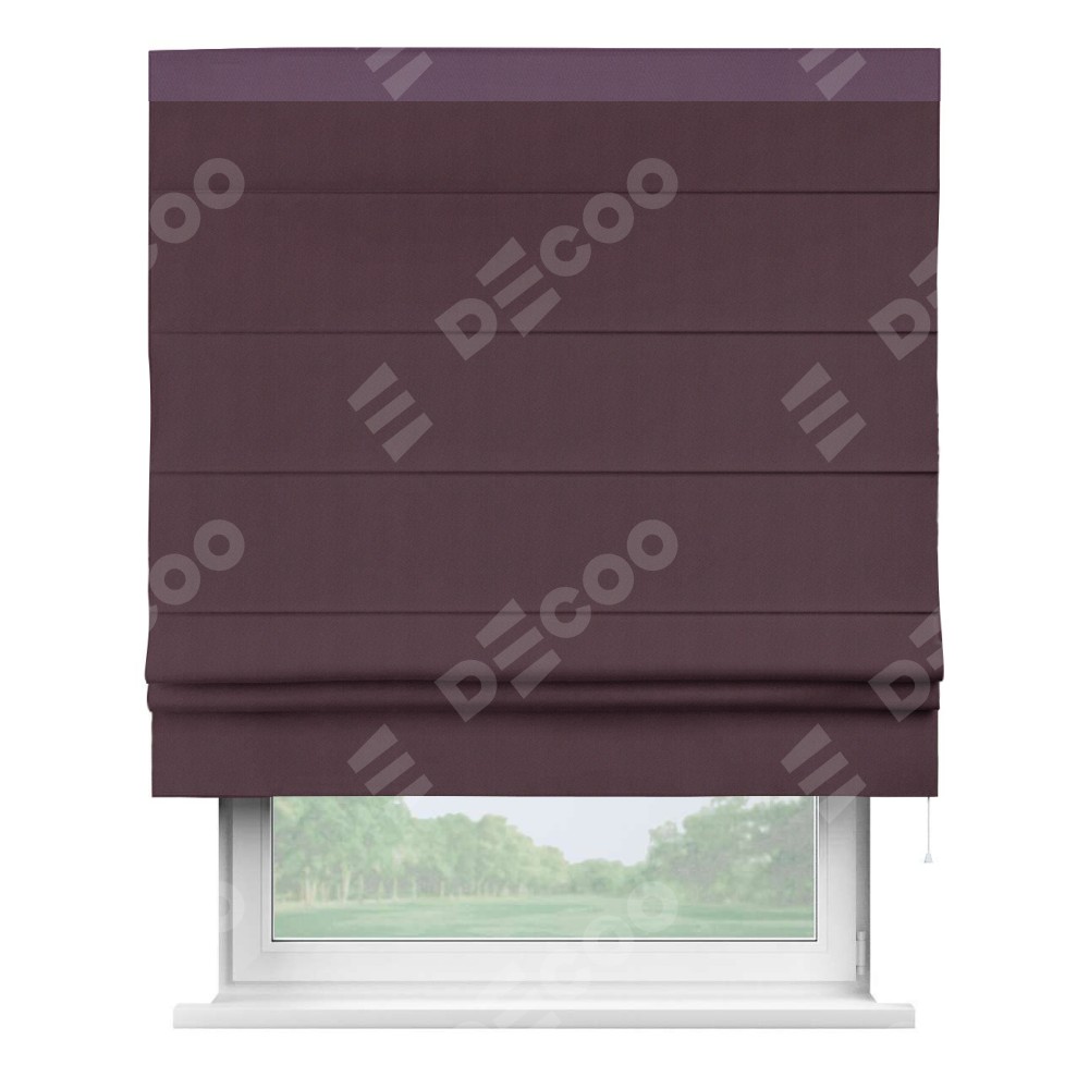 Римская штора производителя «Cortin», используется для проёма, пошита из ткани блэкаут однотонный сиреневый, артикул ткани 29333−2. Отделка шторы кантом «Кинг», ткань для канта используется из блэкаута однотонного разной расцветки на выбор. Имеет универсальный механизм и подходит для монтажа: на потолок, на стену и в нишу.