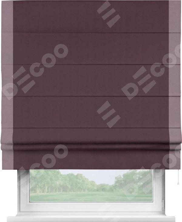 Римская штора производителя «Cortin», используется для проёма, пошита из ткани блэкаут однотонный сиреневый, артикул ткани 29333−2. Отделка шторы кантом «Стрим Дуо», ткань для канта используется из блэкаута однотонного разной расцветки на выбор. Имеет универсальный механизм и подходит для монтажа: на потолок, на стену и в нишу.
