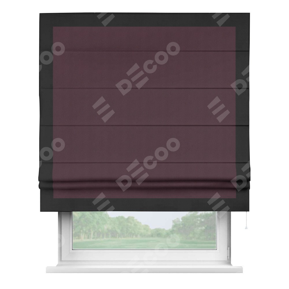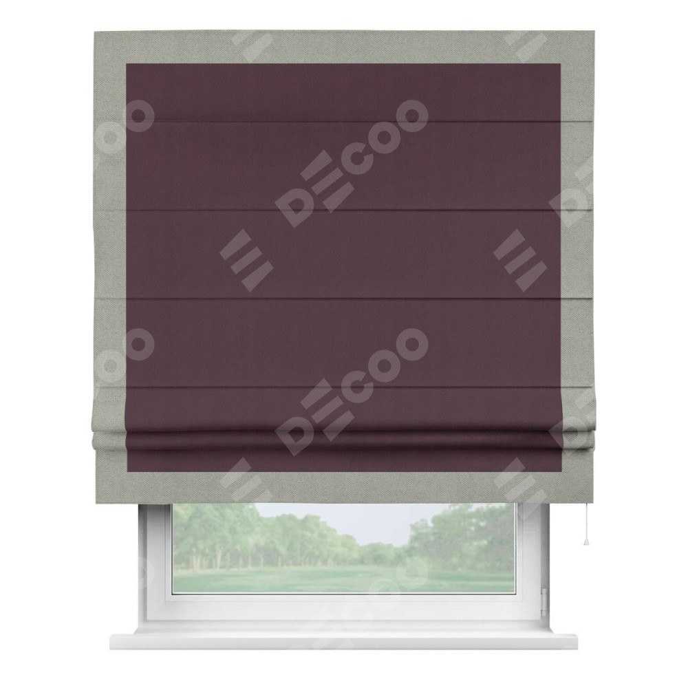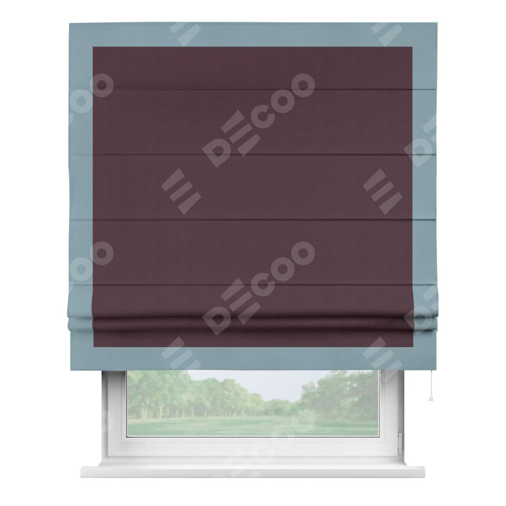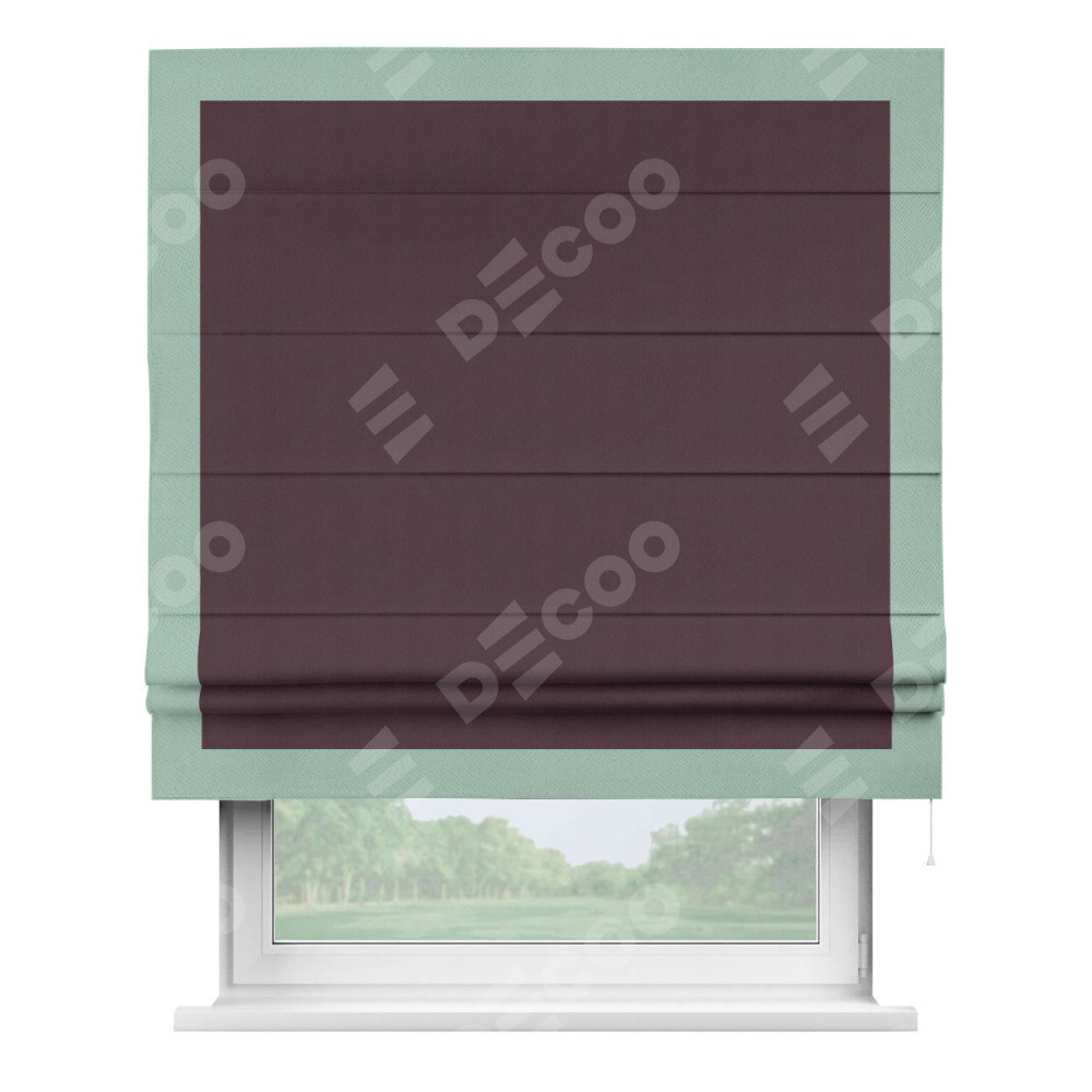 Римская штора производителя «Cortin», используется для проёма, пошита из ткани блэкаут однотонный сиреневый, артикул ткани 29333−2. Отделка шторы кантом «Чесс», ткань для канта используется из блэкаута однотонного разной расцветки на выбор. Имеет универсальный механизм и подходит для монтажа: на потолок, на стену и в нишу.