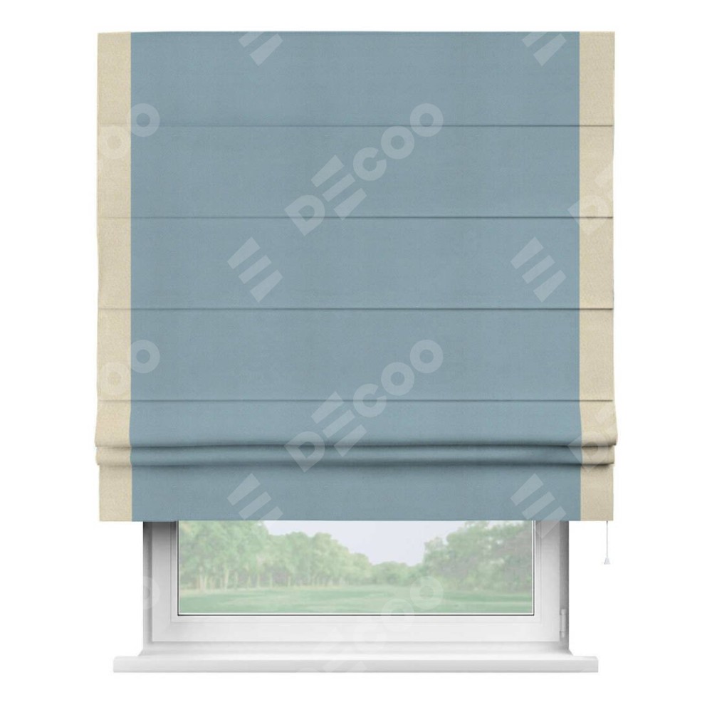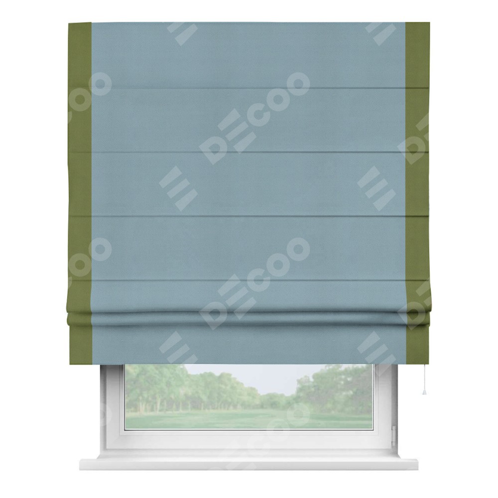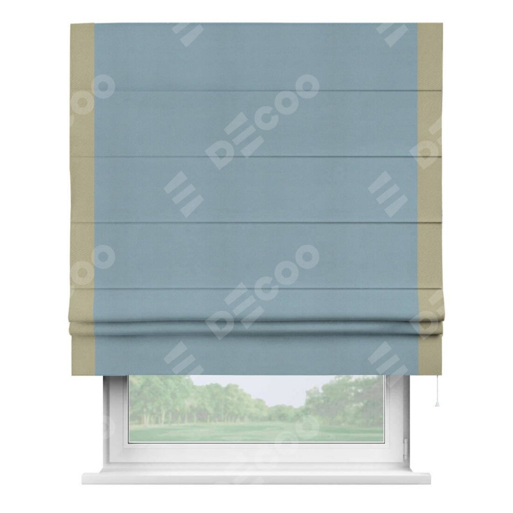Римская штора производителя «Cortin», используется для проёма, пошита из ткани блэкаут однотонный серо-голубой, артикул ткани 29327−2. Отделка шторы кантом «Стрим Дуо», ткань для канта используется из блэкаута однотонного разной расцветки на выбор. Имеет универсальный механизм и подходит для монтажа: на потолок, на стену и в нишу.