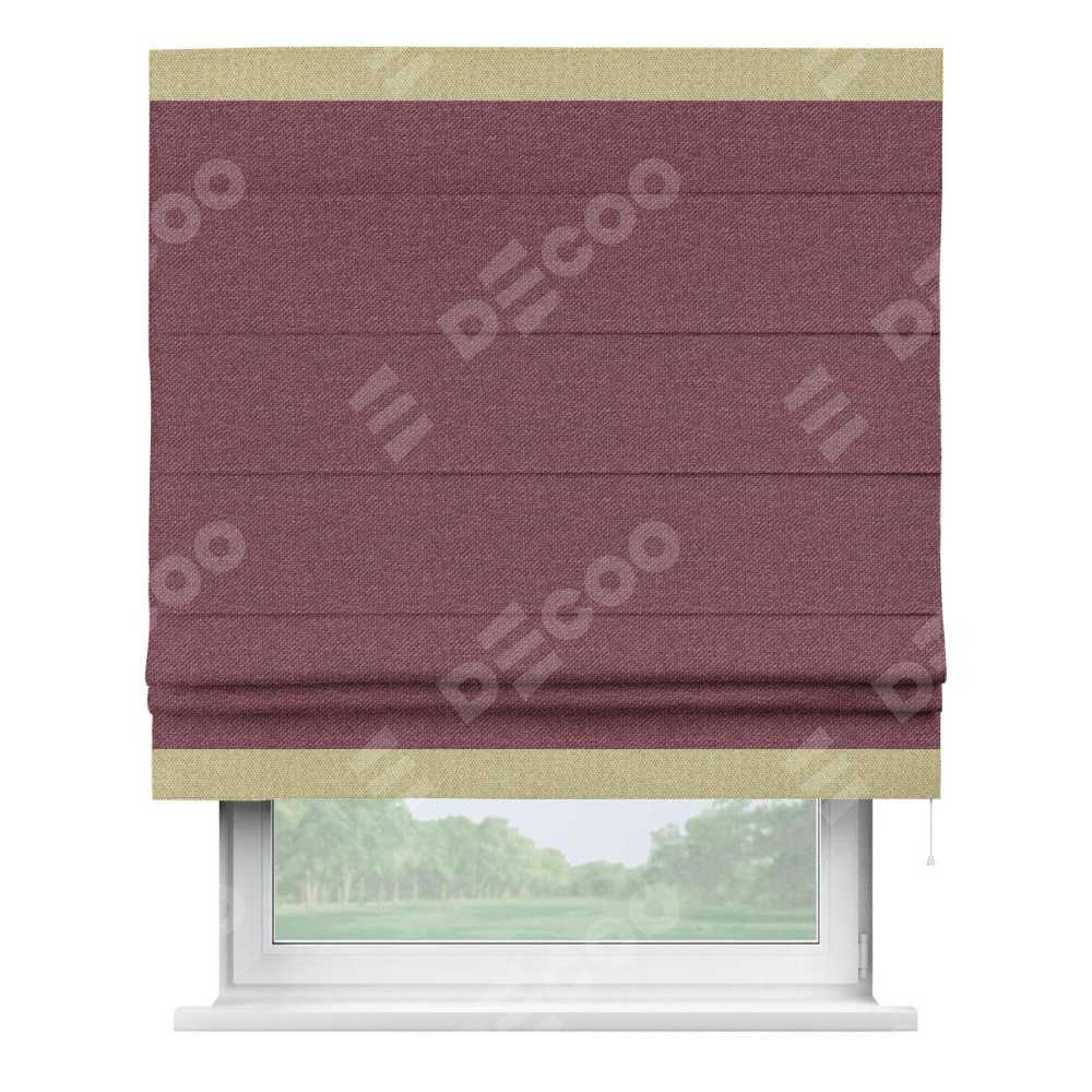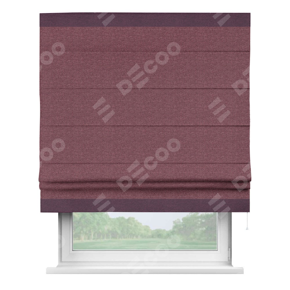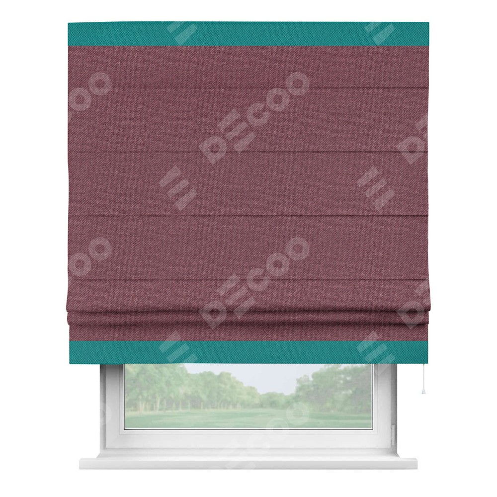 Римская штора производителя «Cortin», используется для проёма, пошита из ткани лён димаут марсала, артикул 1602. Отделка шторы кантом «Горизонт», ткань для канта используется из льна димаут разной расцветки на выбор. Имеет универсальный механизм и подходит для монтажа: на потолок, на стену и в нишу.