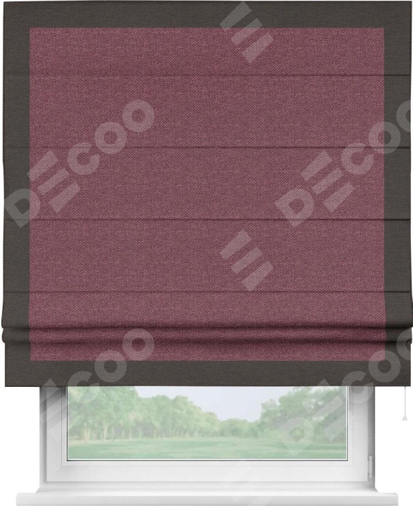 Римская штора производителя «Cortin», используется для проёма, пошита из ткани лён димаут марсала, артикул 1602. Отделка шторы кантом «Чесс», ткань для канта используется из льна димаут разной расцветки на выбор. Имеет универсальный механизм и подходит для монтажа: на потолок, на стену и в нишу.