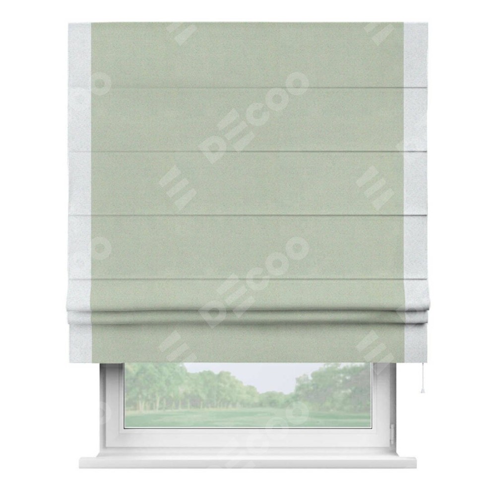 Римская штора производителя «Cortin», используется для проёма, пошита из ткани блэкаут однотонный светло-серый, артикул ткани 29332−2. Отделка шторы кантом «Стрим Дуо», ткань для канта используется из блэкаута однотонного разной расцветки на выбор. Имеет универсальный механизм и подходит для монтажа: на потолок, на стену и в нишу.