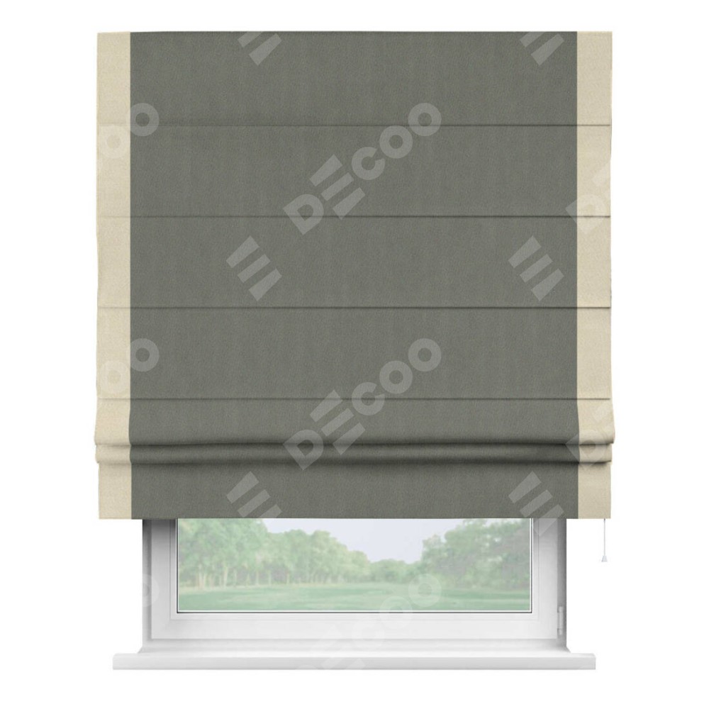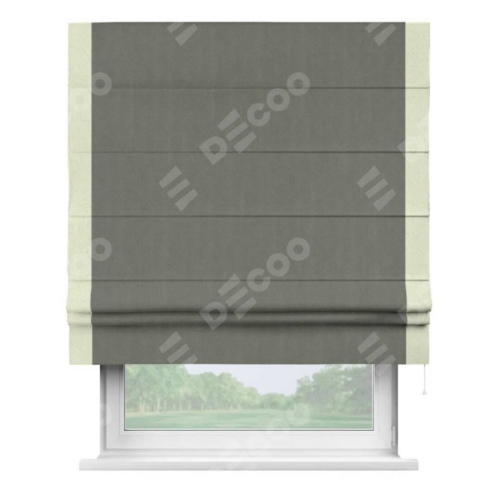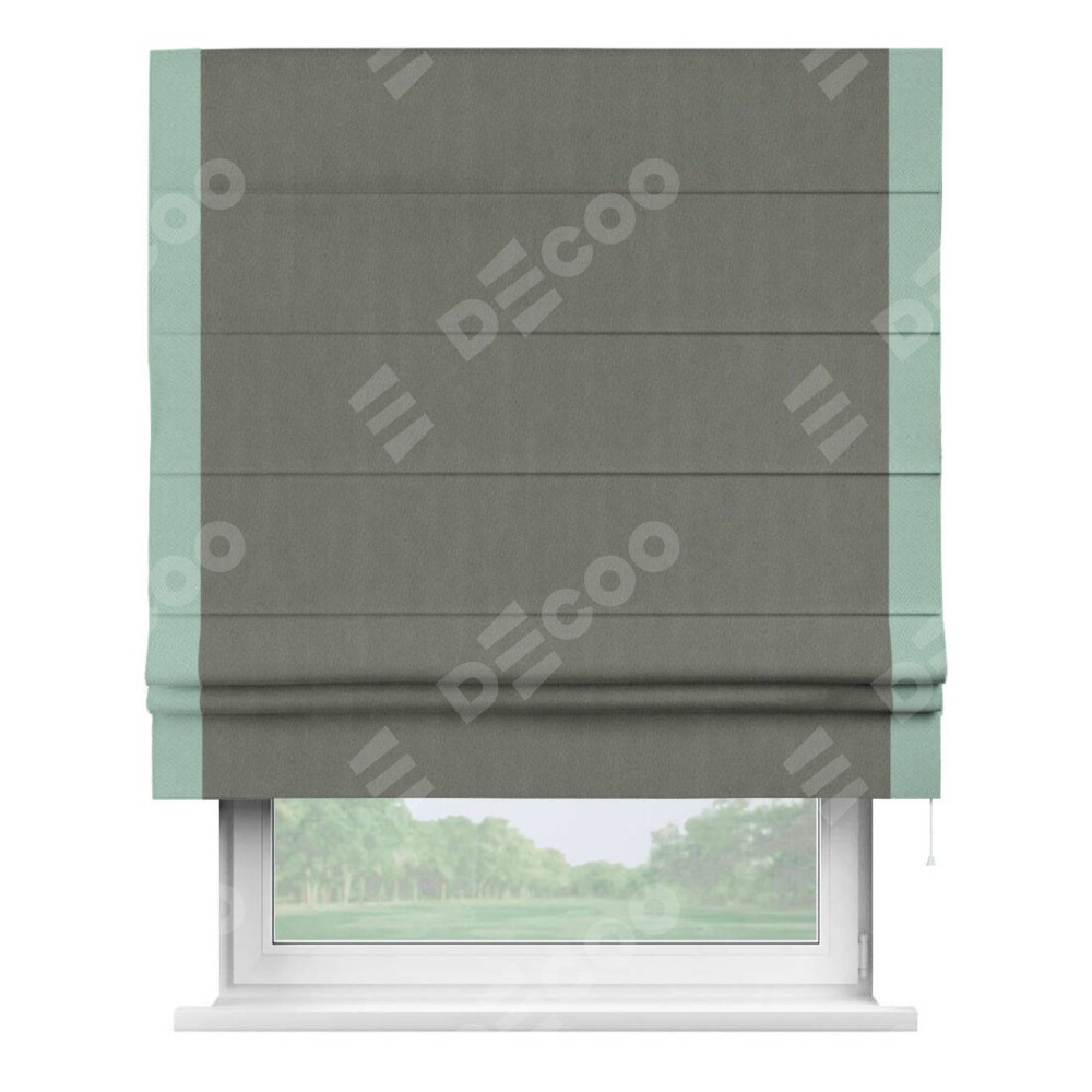 Римская штора производителя «Cortin», используется для проёма, пошита из ткани блэкаут однотонный тёмно-серый, артикул ткани 29332−1. Отделка шторы кантом «Стрим Дуо», ткань для канта используется из блэкаута однотонного разной расцветки на выбор. Имеет универсальный механизм и подходит для монтажа: на потолок, на стену и в нишу.