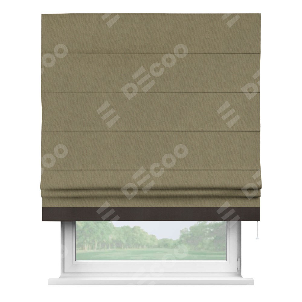 Римская штора производителя «Cortin», используется для проёма, пошита из ткани блэкаут однотонный бежево-золотой, артикул ткани 12095−2. Отделка шторы кантом «Джестер», ткань для канта используется из блэкаута однотонного разной расцветки на выбор. Имеет универсальный механизм и подходит для монтажа: на потолок, на стену и в нишу.