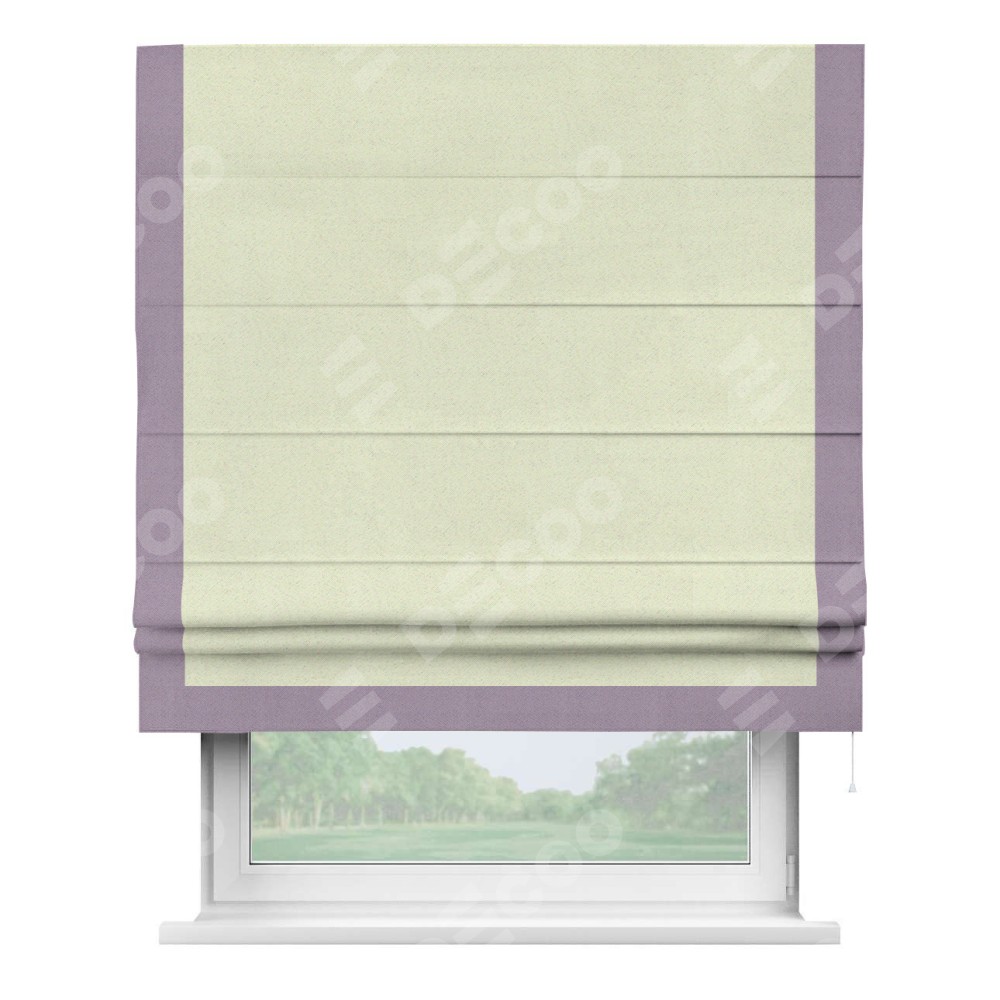 Римская штора производителя «Cortin», используется для проёма, пошита из ткани блэкаут однотонный сливочный, артикул ткани 6668−02. Отделка шторы кантом «Виктория», ткань для канта используется из блэкаута однотонного разной расцветки на выбор. Имеет универсальный механизм и подходит для монтажа: на потолок, на стену и в нишу.