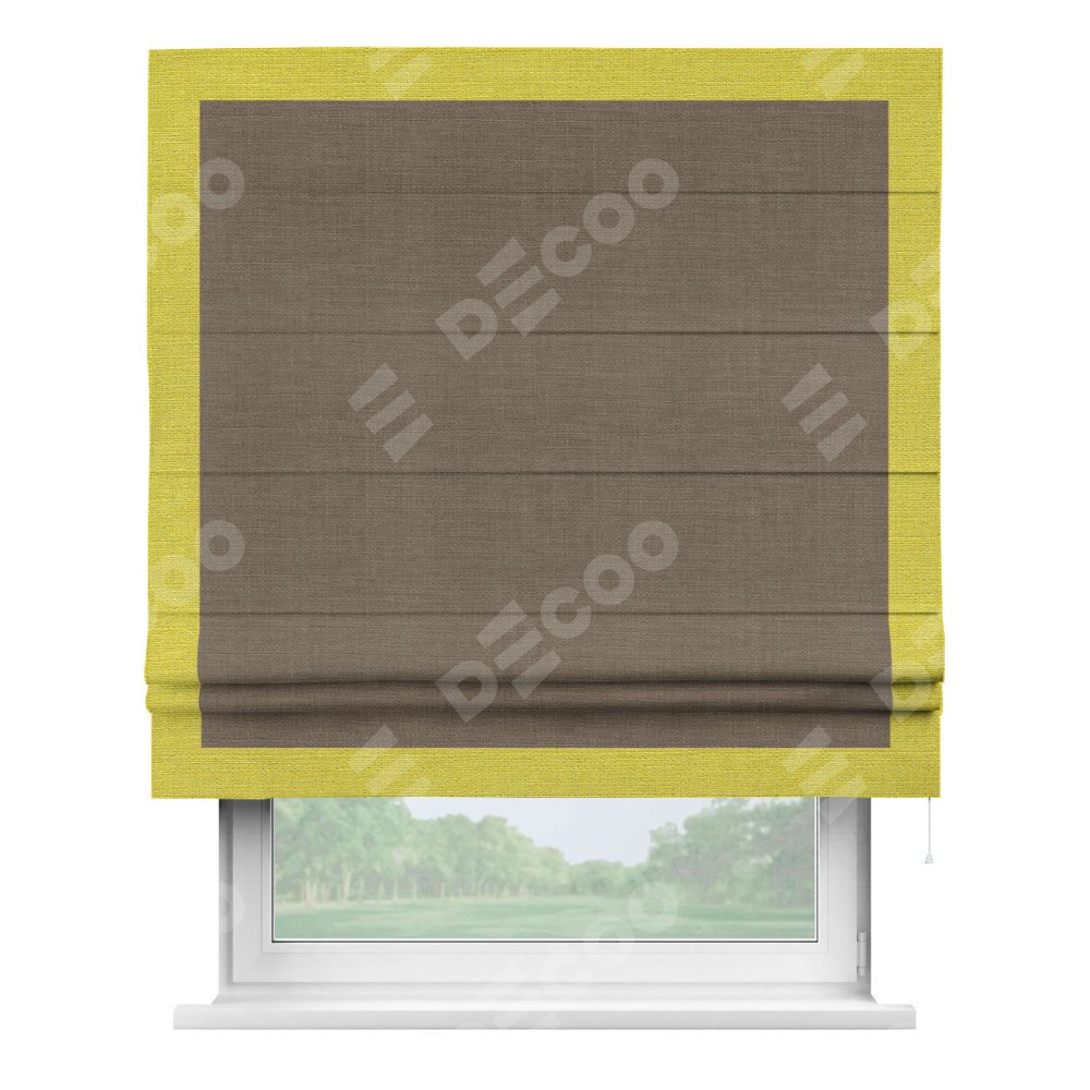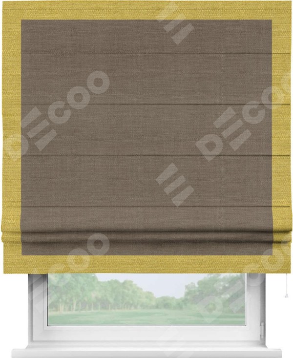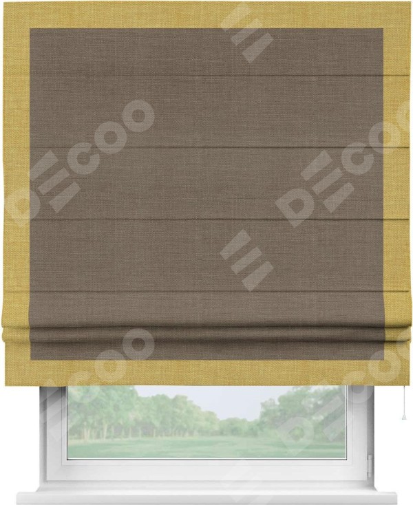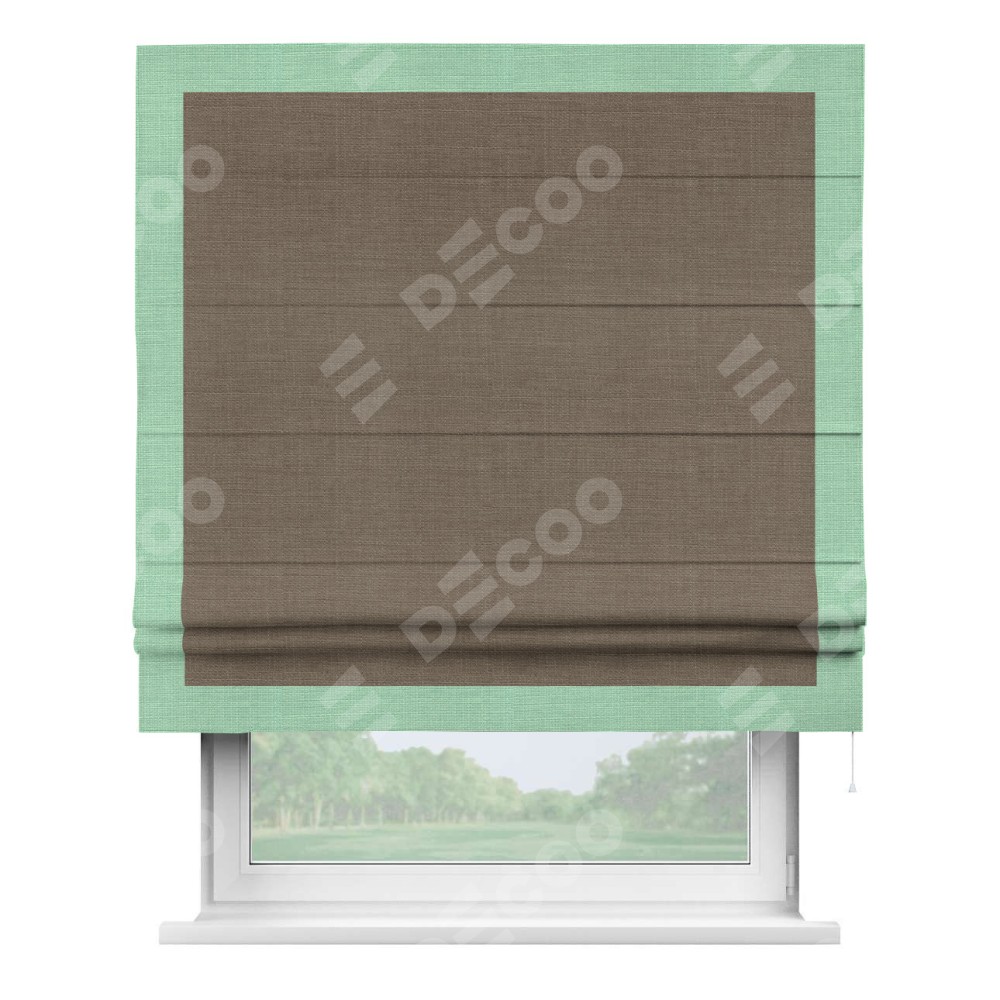 Римская штора производителя «Cortin», используется для проёма, пошита из ткани лён мокко, артикул 7444. Отделка шторы кантом «Чесс», ткань для канта используется из льна разной расцветки на выбор. Имеет универсальный механизм и подходит для монтажа: на потолок, на стену и в нишу.