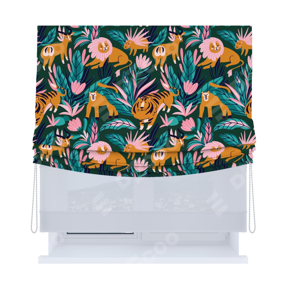 Римская штора день-ночь производителя «Cortin», используется для проёма, пошита из двух полотен, с лицевой блэкаут с нанесением сублимационной печати «Дикие животные», вторая ткань тюль (по стандарту комплектуется тюль белого цвета артикул V-01). Имеет универсальный механизм и подходит для монтажа: на потолок, на стену и в нишу. Удобное управление каждой шторой отдельно.