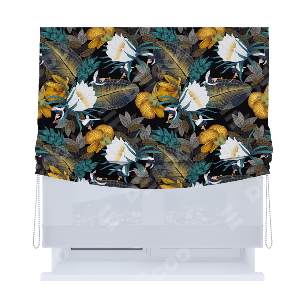 Римская штора день-ночь производителя «Cortin», используется для проёма, пошита из двух полотен, с лицевой блэкаут с нанесением сублимационной печати «Затерянный оазис», вторая ткань тюль (по стандарту комплектуется тюль белого цвета артикул V-01). Имеет универсальный механизм и подходит для монтажа: на потолок, на стену и в нишу. Удобное управление каждой шторой отдельно.