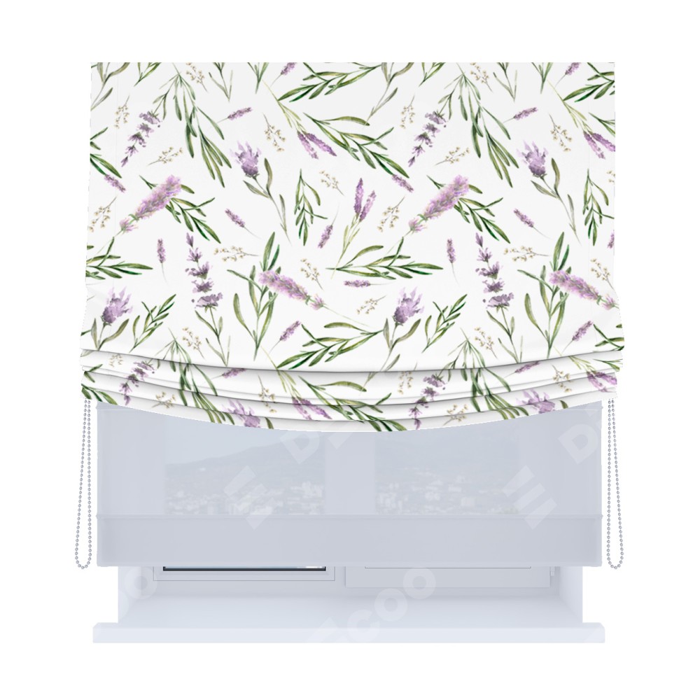 Римская штора день-ночь производителя «Cortin», используется для проёма, пошита из двух полотен, с лицевой блэкаут с нанесением сублимационной печати «Лавандовое поле», вторая ткань тюль (по стандарту комплектуется тюль белого цвета артикул V-01). Имеет универсальный механизм и подходит для монтажа: на потолок, на стену и в нишу. Удобное управление каждой шторой отдельно.
