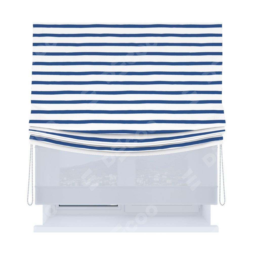 Римская штора день-ночь производителя «Cortin», используется для проёма, пошита из двух полотен, с лицевой блэкаут с нанесением сублимационной печати «Морская полоска», вторая ткань тюль (по стандарту комплектуется тюль белого цвета артикул V-01). Имеет универсальный механизм и подходит для монтажа: на потолок, на стену и в нишу. Удобное управление каждой шторой отдельно.