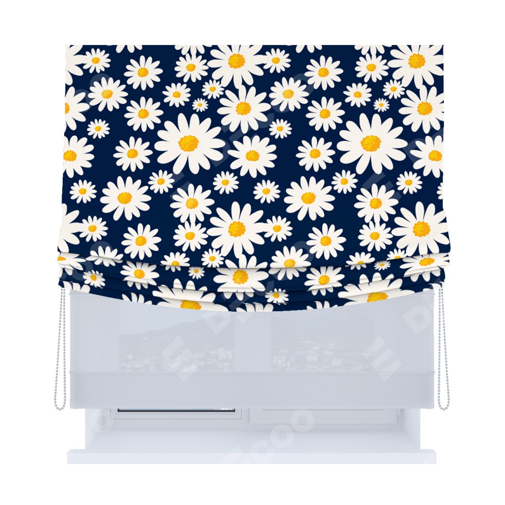 Римская штора день-ночь производителя «Cortin», используется для проёма, пошита из двух полотен, с лицевой блэкаут с нанесением сублимационной печати «Яркие ромашки», вторая ткань тюль (по стандарту комплектуется тюль белого цвета артикул V-01). Имеет универсальный механизм и подходит для монтажа: на потолок, на стену и в нишу. Удобное управление каждой шторой отдельно.