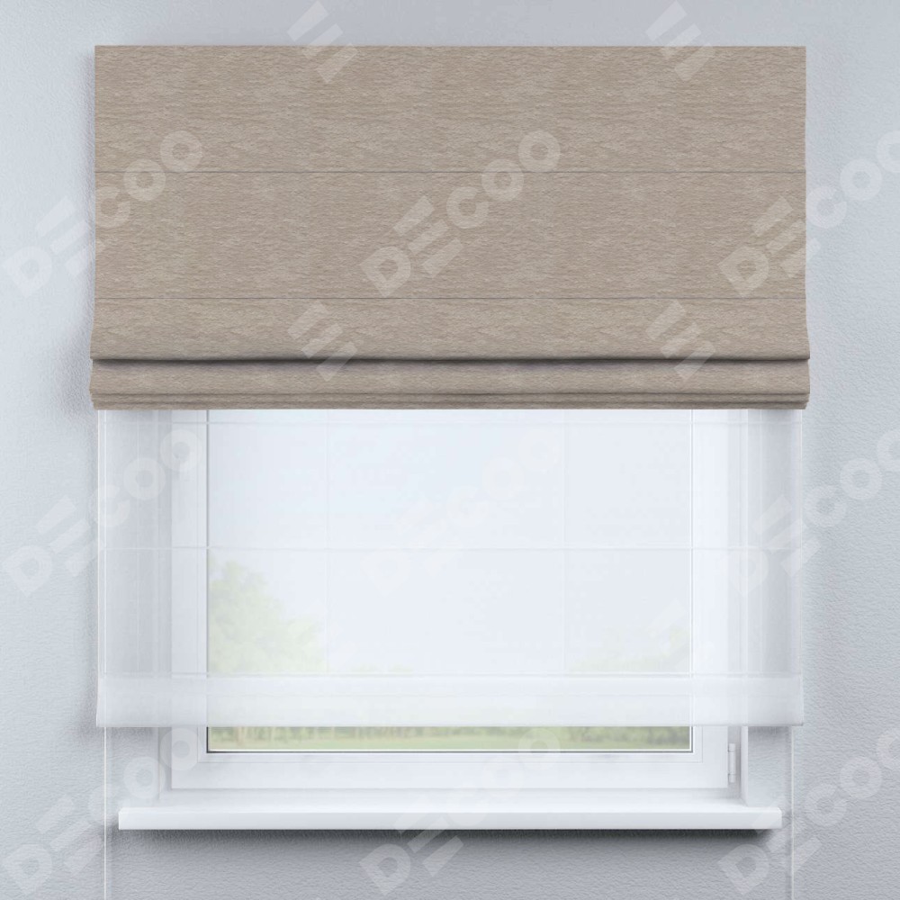 Римская штора день-ночь производителя «Cortin», используется для проёма, пошита из двух полотен, с лицевой стороны софт однотонный тёмно-бежевый артикул 1640, вторая ткань тюль (по стандарту комплектуется тюль белого цвета артикул V-01). Имеет универсальный механизм и подходит для монтажа: на потолок, на стену и в нишу.