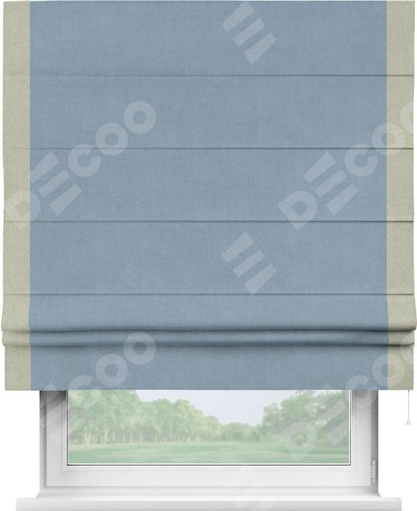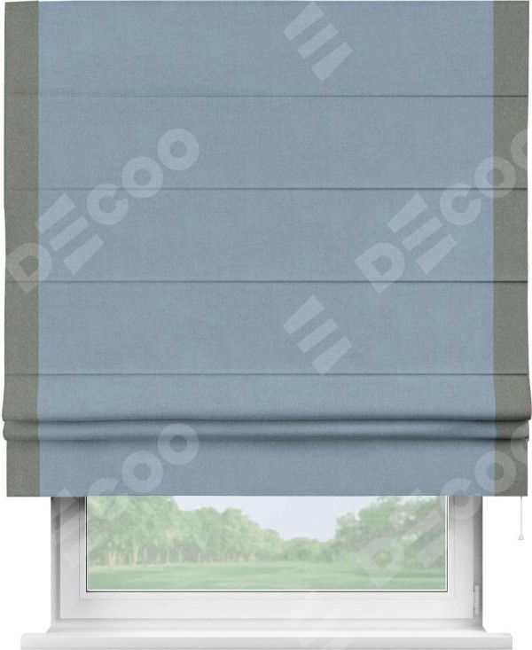 Римская штора производителя «Cortin», используется для проёма, пошита из ткани лён блэкаут голубой, артикул 69574. Отделка шторы кантом «Стрим Дуо», ткань для канта используется из льна разной расцветки на выбор. Имеет универсальный механизм и подходит для монтажа: на потолок, на стену и в нишу.