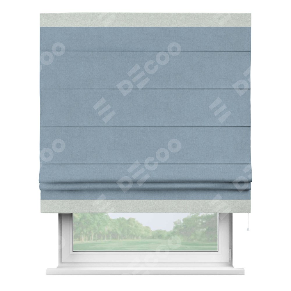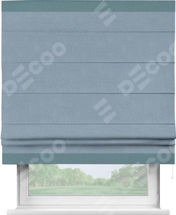 Римская штора производителя «Cortin», используется для проёма, пошита из ткани лён блэкаут голубой, артикул 69574. Отделка шторы кантом «Горизонт», ткань для канта используется из льна разной расцветки на выбор. Имеет универсальный механизм и подходит для монтажа: на потолок, на стену и в нишу.