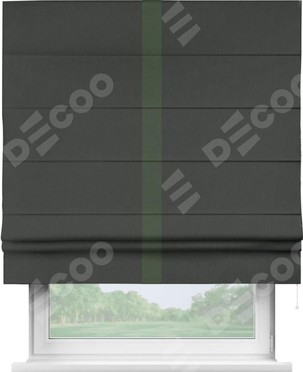 Римская штора производителя «Cortin», используется для проёма, пошита из ткани лён блэкаут графит, артикул 69448. Отделка шторы кантом «Хайвэй», ткань для канта используется из льна разной расцветки на выбор. Имеет универсальный механизм и подходит для монтажа: на потолок, на стену и в нишу.
