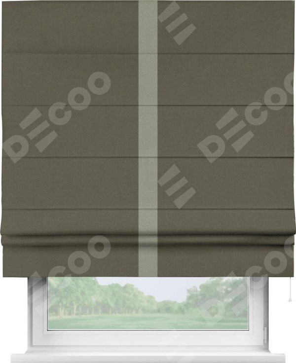 Римская штора производителя «Cortin», используется для проёма, пошита из ткани лён блэкаут коричневый, артикул 69383. Отделка шторы кантом «Хайвэй», ткань для канта используется из льна разной расцветки на выбор. Имеет универсальный механизм и подходит для монтажа: на потолок, на стену и в нишу.