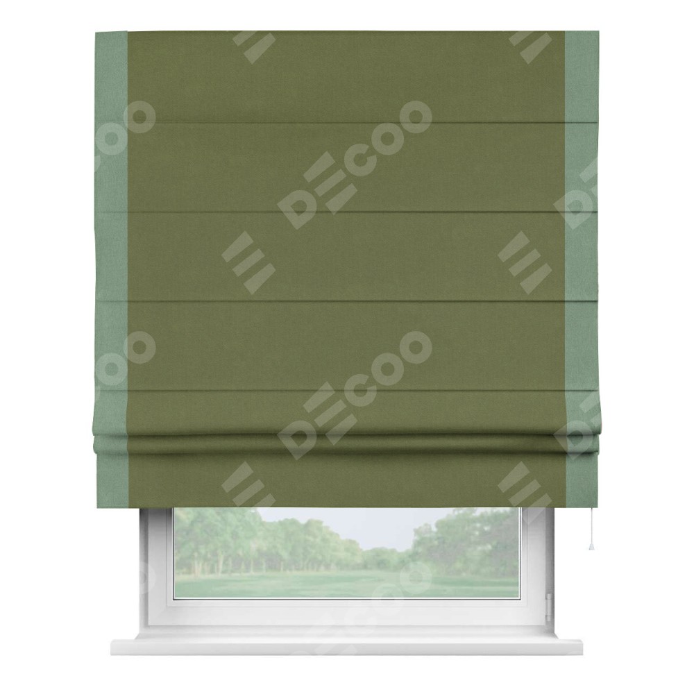 Римская штора производителя «Cortin», используется для проёма, пошита из ткани лён блэкаут оливковый, артикул 69516. Отделка шторы кантом «Стрим Дуо», ткань для канта используется из льна разной расцветки на выбор. Имеет универсальный механизм и подходит для монтажа: на потолок, на стену и в нишу.