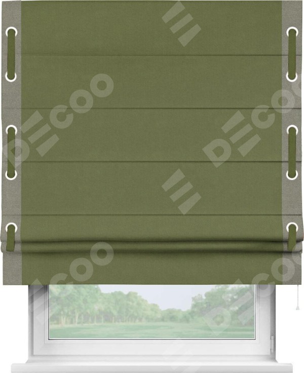 Римская штора производителя «Cortin», используется для проёма, пошита из ткани лён блэкаут оливковый, артикул 69516. Отделка шторы кантом «Стрим Дуо» на кантах расположены люверсы с пояском, ткань для канта используется из льна разной расцветки на выбор. Ткань для пояска обычно используется из основной ткани шторы, а так же можно сделать из любой расцветки по желанию. Имеет универсальный механизм и подходит для монтажа: на потолок, на стену и в нишу.