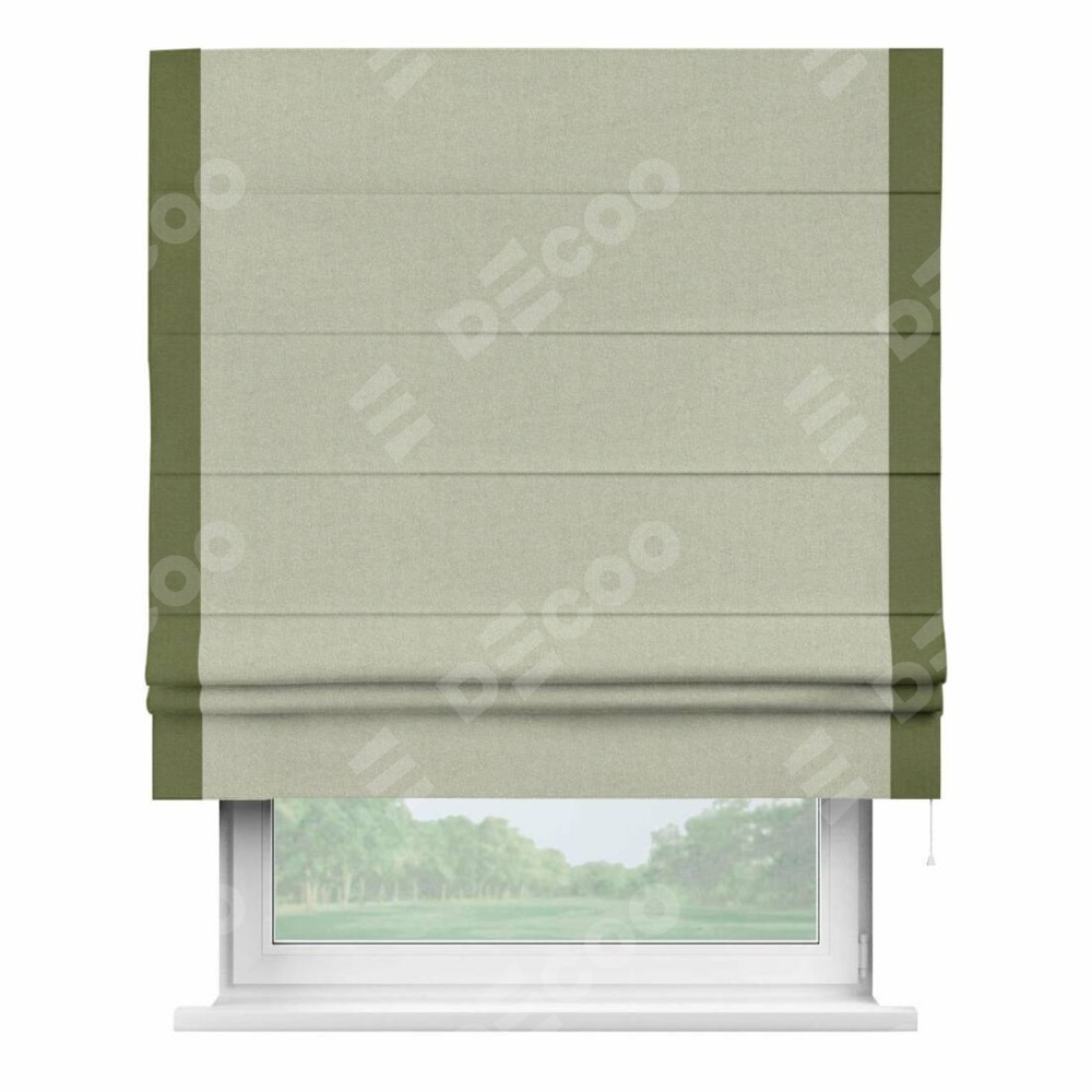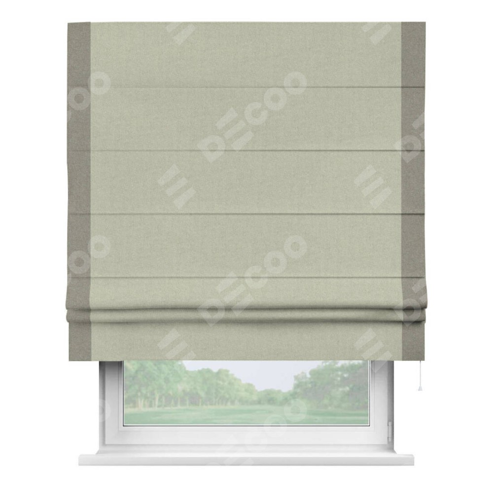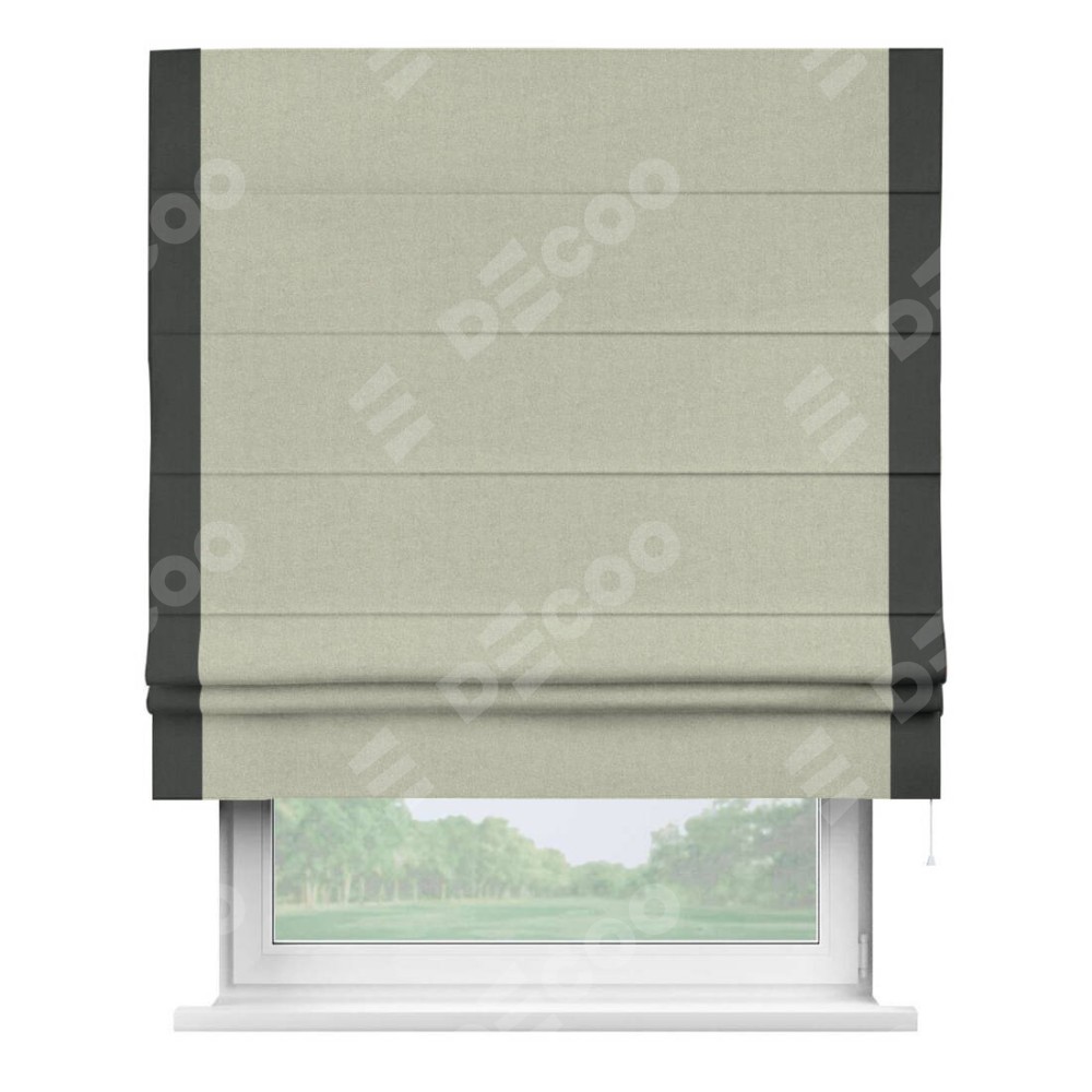 Римская штора производителя «Cortin», используется для проёма, пошита из ткани лён блэкаут серо-бежевый, артикул 69450. Отделка шторы кантом «Стрим Дуо», ткань для канта используется из льна разной расцветки на выбор. Имеет универсальный механизм и подходит для монтажа: на потолок, на стену и в нишу.