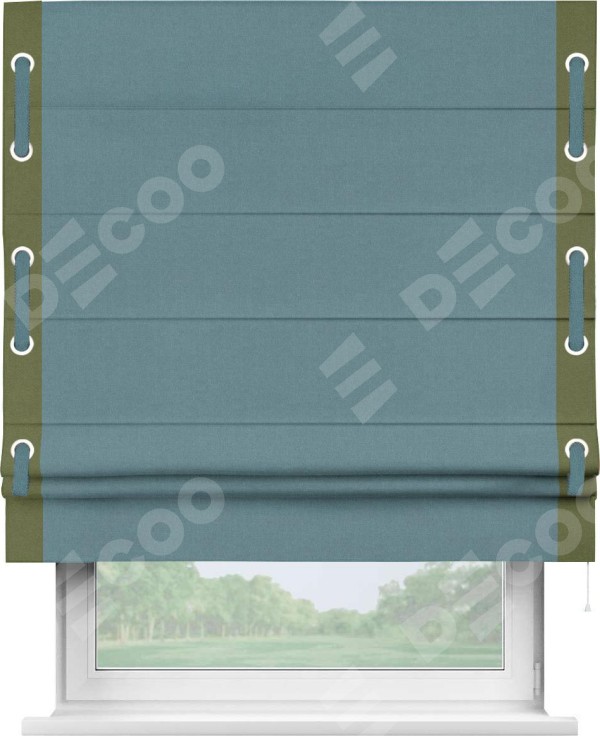 Римская штора производителя «Cortin», используется для проёма, пошита из ткани лён блэкаут синий, артикул 69528. Отделка шторы кантом «Стрим Дуо» на кантах расположены люверсы с пояском, ткань для канта используется из льна разной расцветки на выбор. Ткань для пояска обычно используется из основной ткани шторы, а так же можно сделать из любой расцветки по желанию. Имеет универсальный механизм и подходит для монтажа: на потолок, на стену и в нишу.