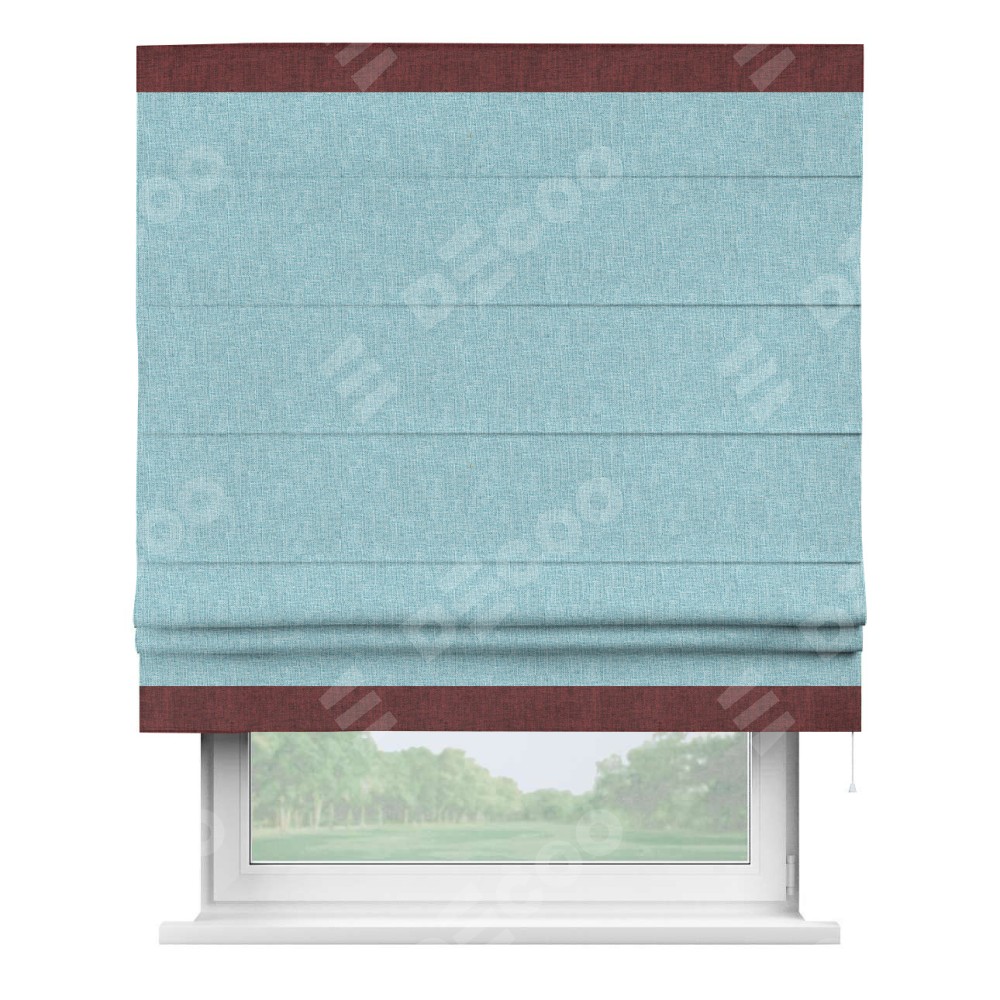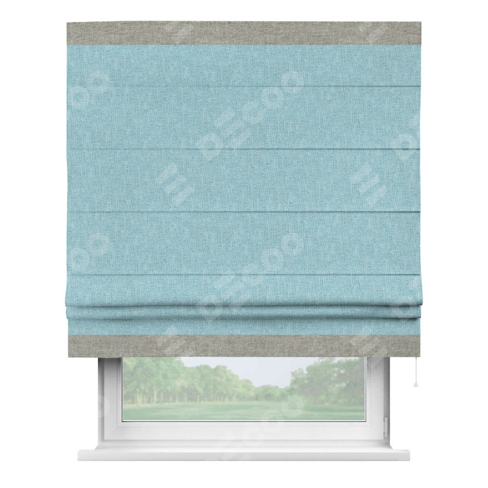 Римская штора производителя «Cortin», используется для проёма, пошита из ткани лён кашемир голубой, артикул 21616. Отделка шторы кантом «Горизонт», ткань для канта используется из льна разной расцветки на выбор. Имеет универсальный механизм и подходит для монтажа: на потолок, на стену и в нишу.