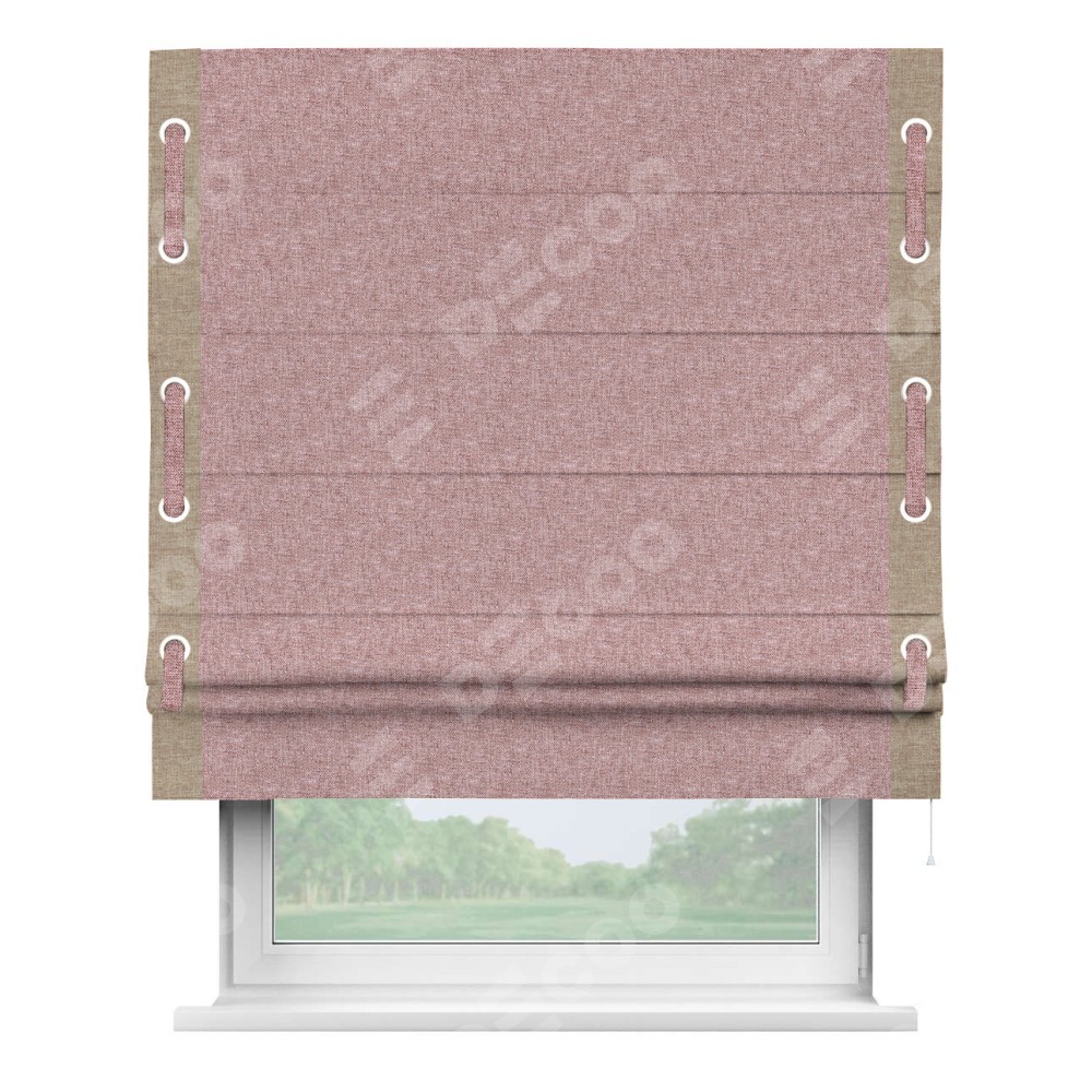 Римская штора производителя «Cortin», используется для проёма, пошита из ткани лён кашемир розовая пудра, артикул 21619. Отделка шторы кантом «Стрим Дуо» на кантах расположены люверсы с пояском, ткань для канта используется из льна разной расцветки на выбор. Ткань для пояска обычно используется из основной ткани шторы, а так же можно сделать из любой расцветки по желанию. Имеет универсальный механизм и подходит для монтажа: на потолок, на стену и в нишу.