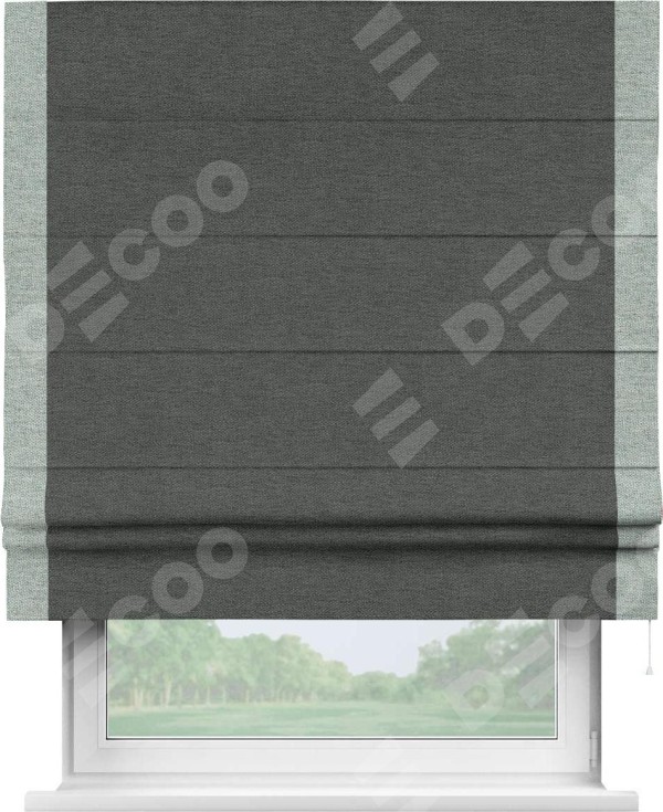 Римская штора производителя «Cortin», используется для проёма, пошита из ткани стиф димаут графит, артикул 44026. Отделка шторы кантом «Стрим Дуо», ткань для канта используется из стифа разной расцветки на выбор. Имеет универсальный механизм и подходит для монтажа: на потолок, на стену и в нишу.