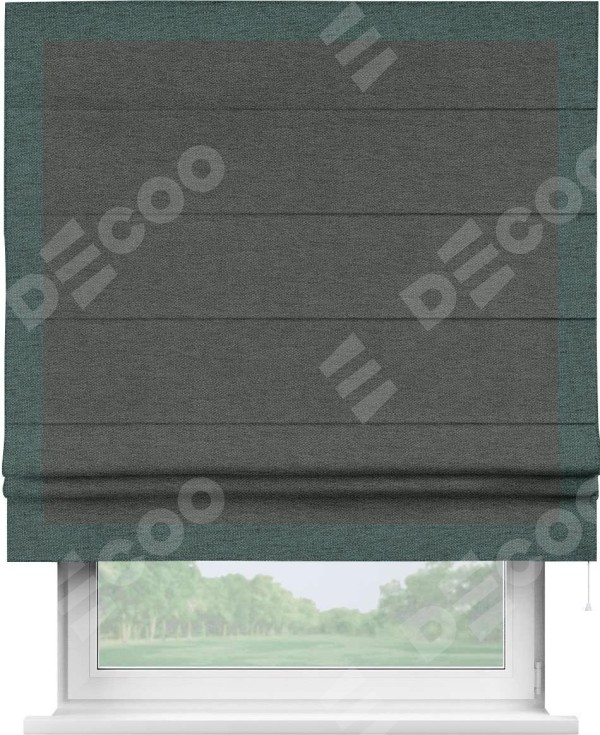 Римская штора производителя «Cortin», используется для проёма, пошита из ткани стиф димаут графит, артикул 44026. Отделка шторы кантом «Чесс», ткань для канта используется из стифа разной расцветки на выбор. Имеет универсальный механизм и подходит для монтажа: на потолок, на стену и в нишу.