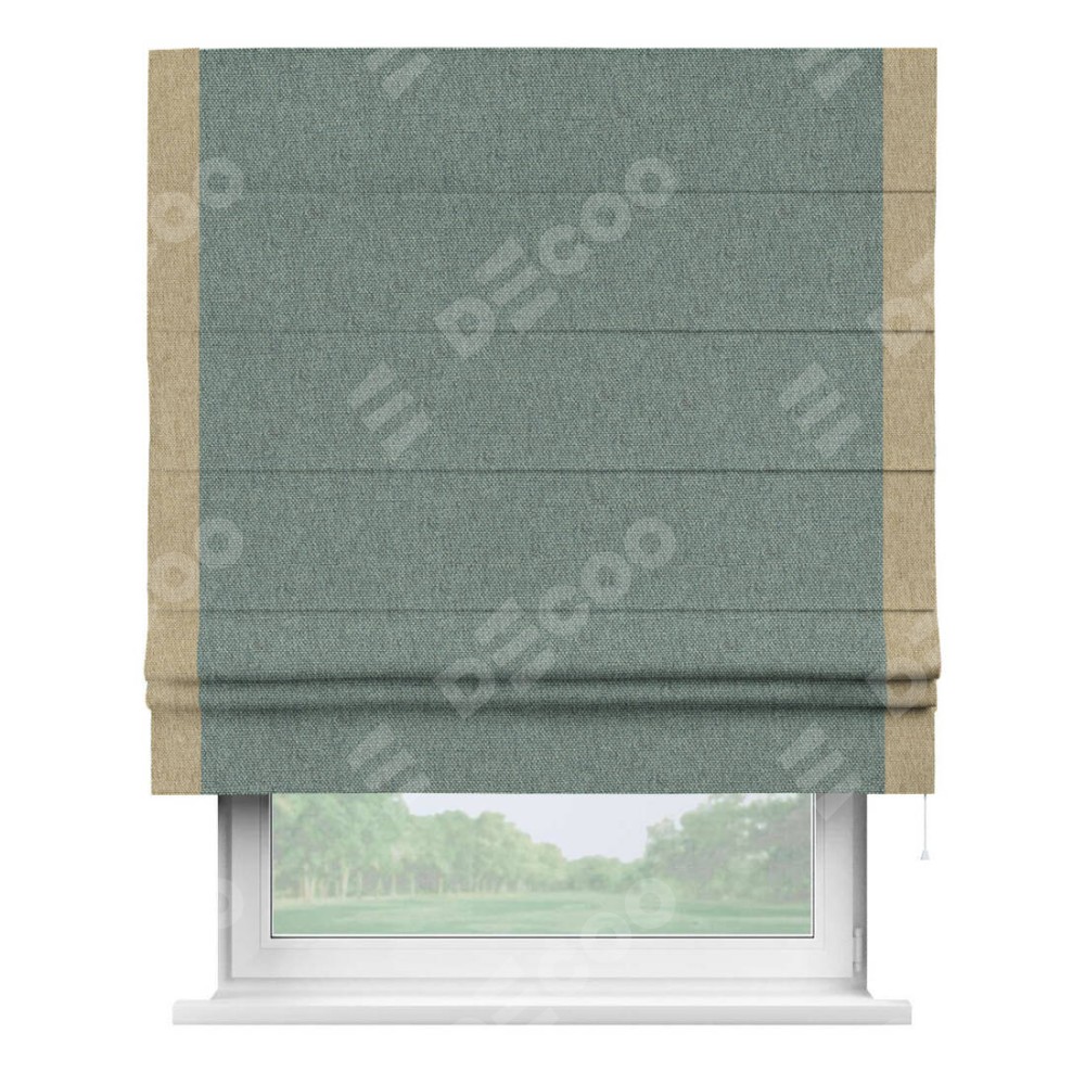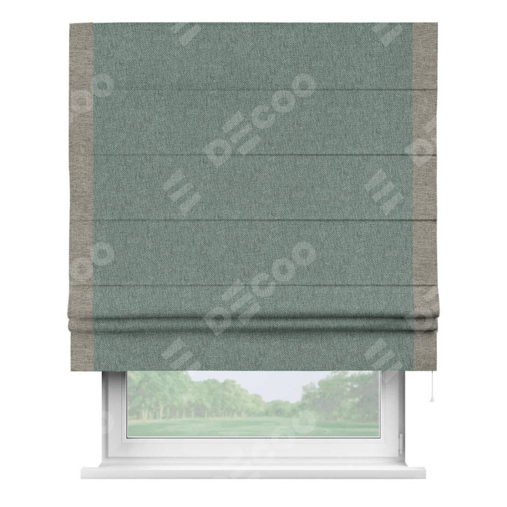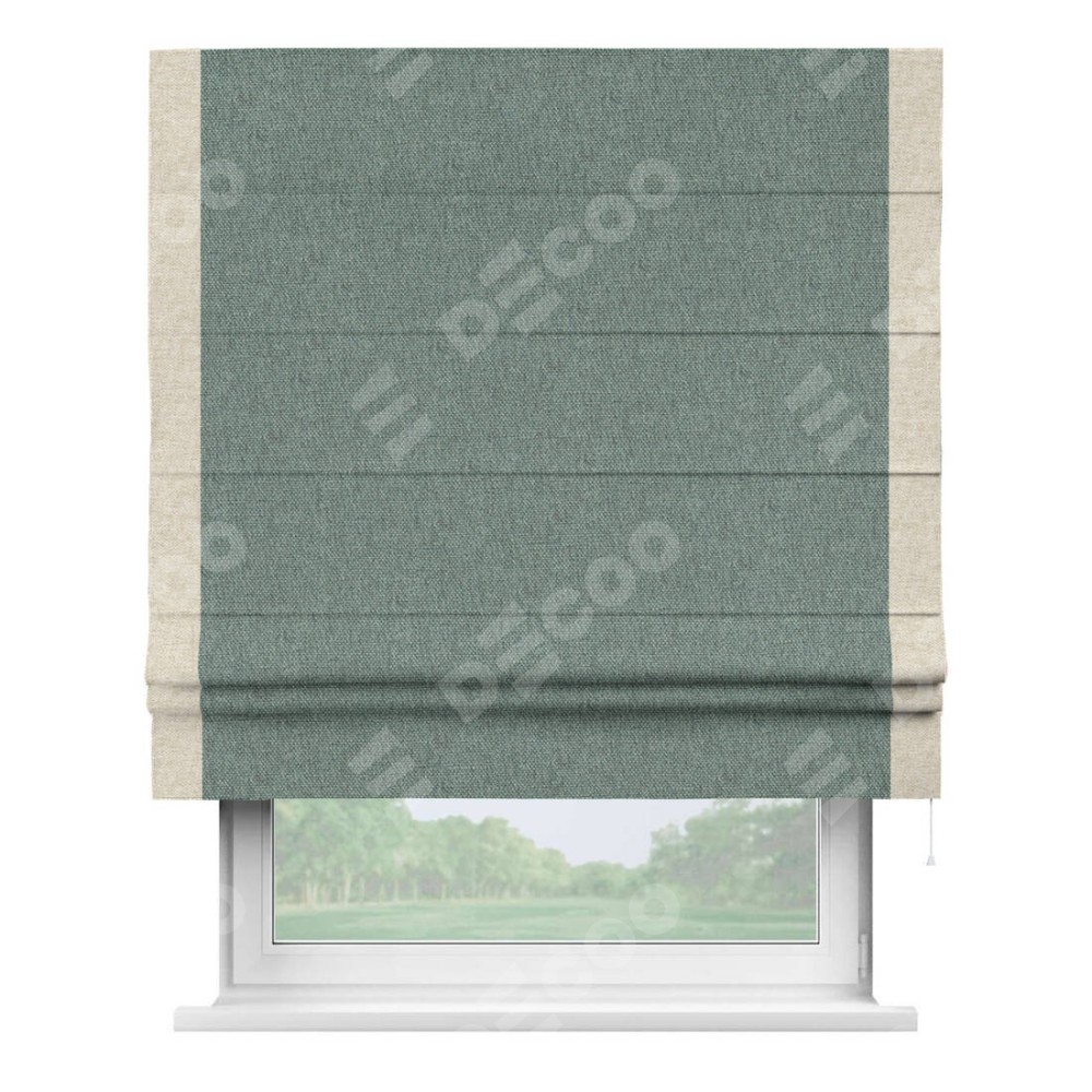 Римская штора производителя «Cortin», используется для проёма, пошита из ткани стиф димаут серо-голубой, артикул 44029. Отделка шторы кантом «Стрим Дуо», ткань для канта используется из стифа разной расцветки на выбор. Имеет универсальный механизм и подходит для монтажа: на потолок, на стену и в нишу.