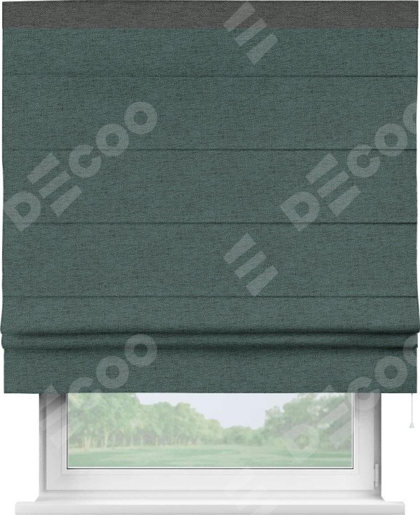 Римская штора производителя «Cortin», используется для проёма, пошита из ткани стиф димаут сине-зелёный, артикул 18194. Отделка шторы кантом «Кинг», ткань для канта используется из стифа разной расцветки на выбор. Имеет универсальный механизм и подходит для монтажа: на потолок, на стену и в нишу.