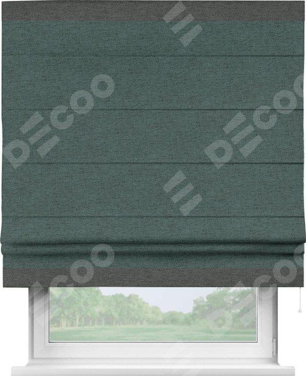 Римская штора производителя «Cortin», используется для проёма, пошита из ткани стиф димаут сине-зелёный, артикул 18194. Отделка шторы кантом «Горизонт», ткань для канта используется из стифа разной расцветки на выбор. Имеет универсальный механизм и подходит для монтажа: на потолок, на стену и в нишу.