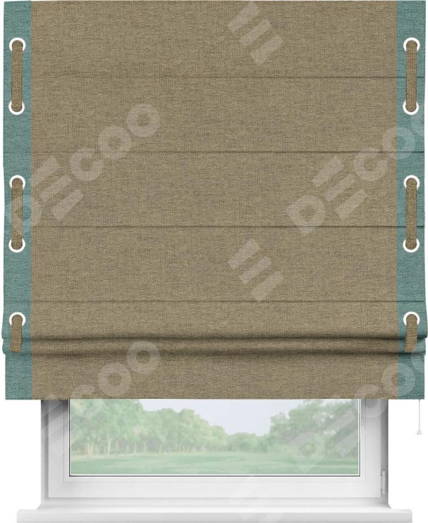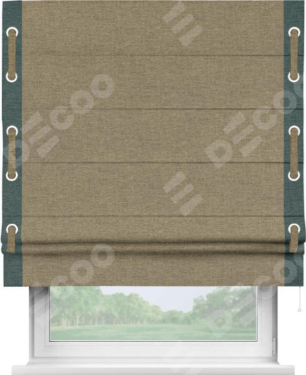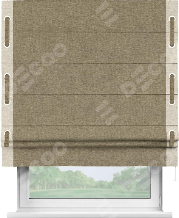 Римская штора производителя «Cortin», используется для проёма, пошита из ткани стиф димаут тёмно-бежевый, артикул 18085. Отделка шторы кантом «Стрим Дуо» на кантах расположены люверсы с пояском, ткань для канта используется из стифа разной расцветки на выбор. Ткань для пояска обычно используется из основной ткани шторы, а так же можно сделать из любой расцветки по желанию. Имеет универсальный механизм и подходит для монтажа: на потолок, на стену и в нишу.