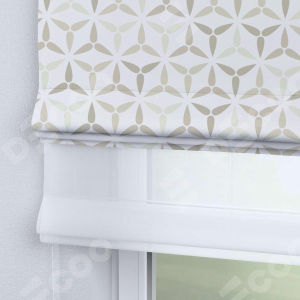 Римская штора день-ночь производителя «Cortin», используется для проёма, пошита из двух полотен, с лицевой блэкаут с нанесением сублимационной печати «Бежевая графика», вторая ткань тюль (по стандарту комплектуется тюль белого цвета артикул V-01). Имеет универсальный механизм и подходит для монтажа: на потолок, на стену и в нишу.