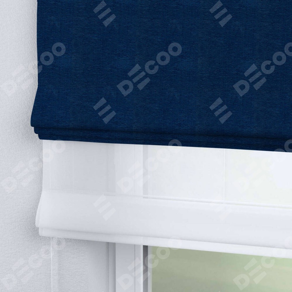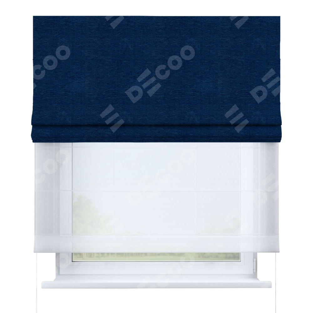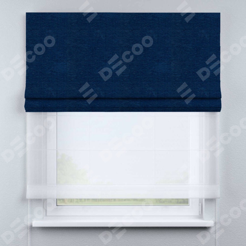 Римская штора день-ночь производителя «Cortin», используется для проёма, пошита из двух полотен, с лицевой стороны софт однотонный синий артикул 42937, вторая ткань тюль (по стандарту комплектуется тюль белого цвета артикул V-01). Имеет универсальный механизм и подходит для монтажа: на потолок, на стену и в нишу.