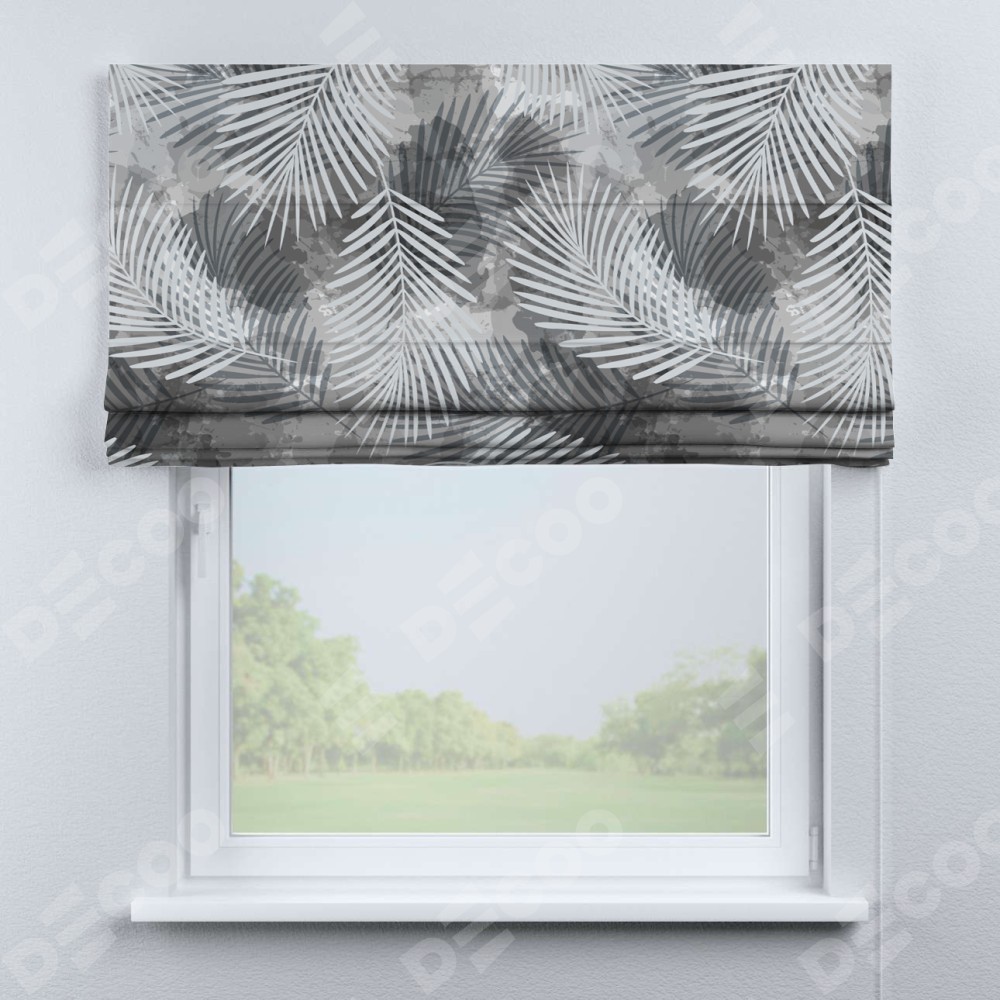 Римская штора производителя «Cortin», используется для проёма, пошита из ткани блэкаут с нанесением сублимационной печати «Листья в тени». Имеет универсальный механизм и подходит для монтажа: на потолок, на стену и в нишу.