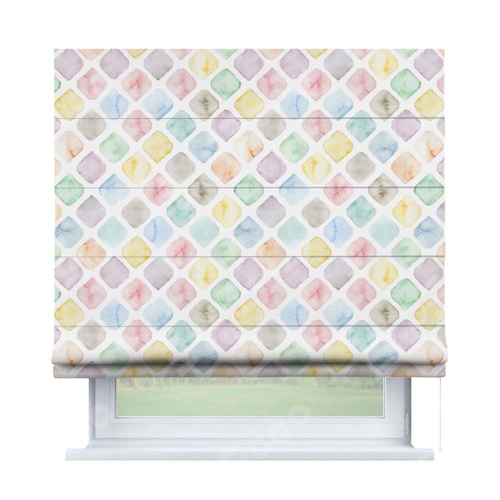 Римская штора производителя «Cortin», используется для проёма, пошита из ткани блэкаут с нанесением сублимационной печати «Мозаика акварель». Имеет универсальный механизм и подходит для монтажа: на потолок, на стену и в нишу.