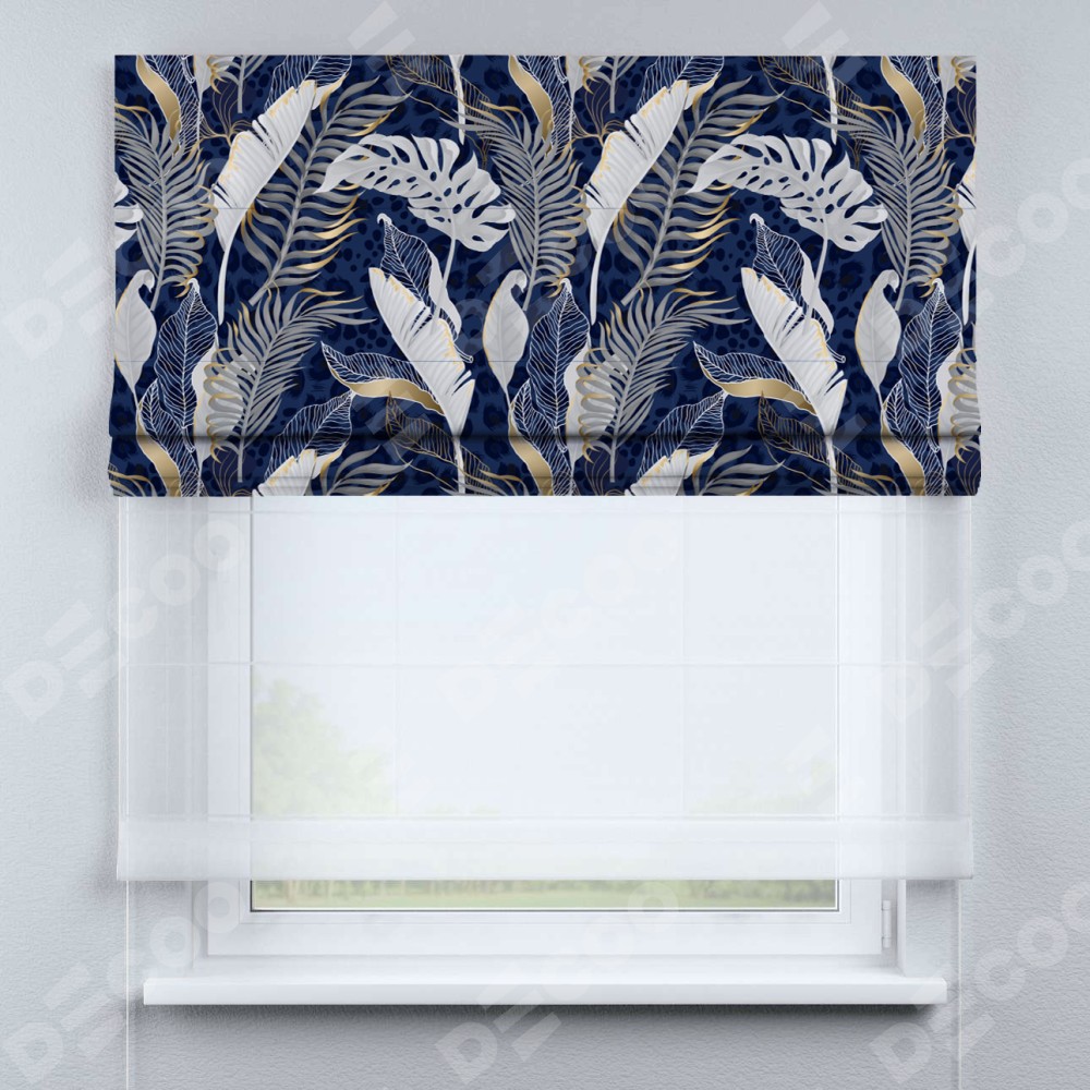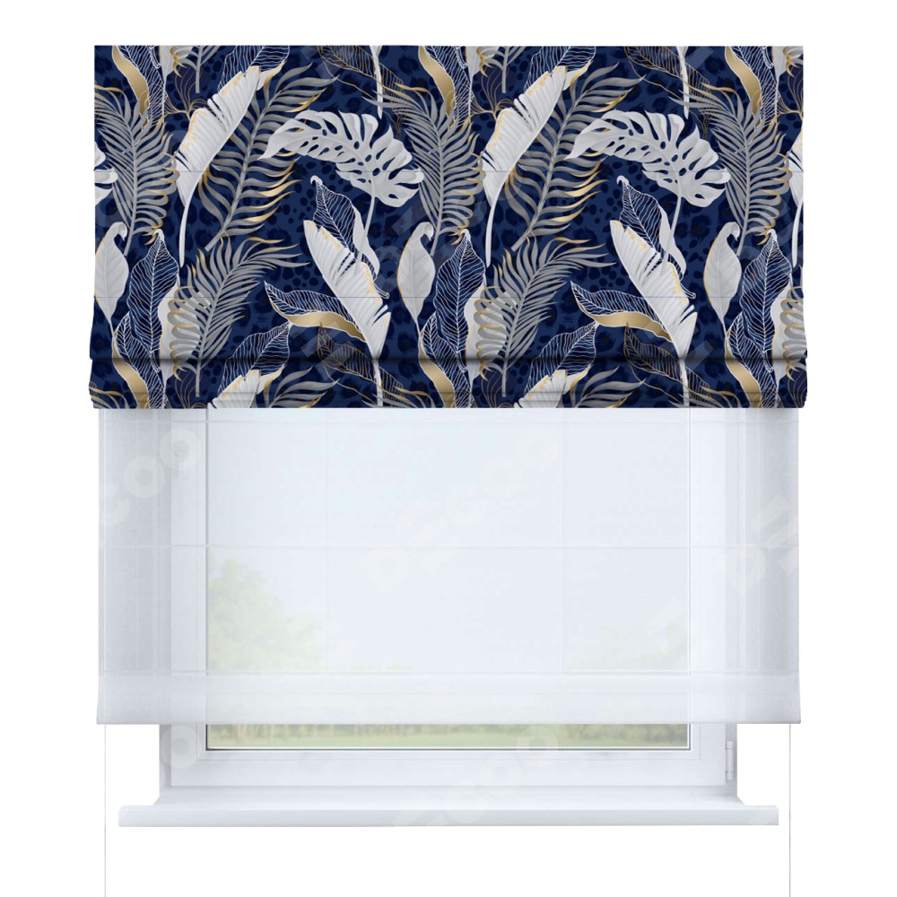 Римская штора день-ночь производителя «Cortin», используется для проёма, пошита из двух полотен, с лицевой блэкаут с нанесением сублимационной печати «Сине-золотые джунгли», вторая ткань тюль (по стандарту комплектуется тюль белого цвета артикул V-01). Имеет универсальный механизм и подходит для монтажа: на потолок, на стену и в нишу.